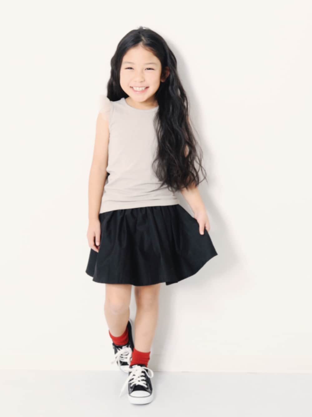 こんばんは🙌🏻 今年の新色、グレージュが超絶かわいい、、🤤 肌馴染みがよくて、何にでも合わせやすい絶妙な色味☝︎ モデル身長:115cm 着用サイズ:110cm