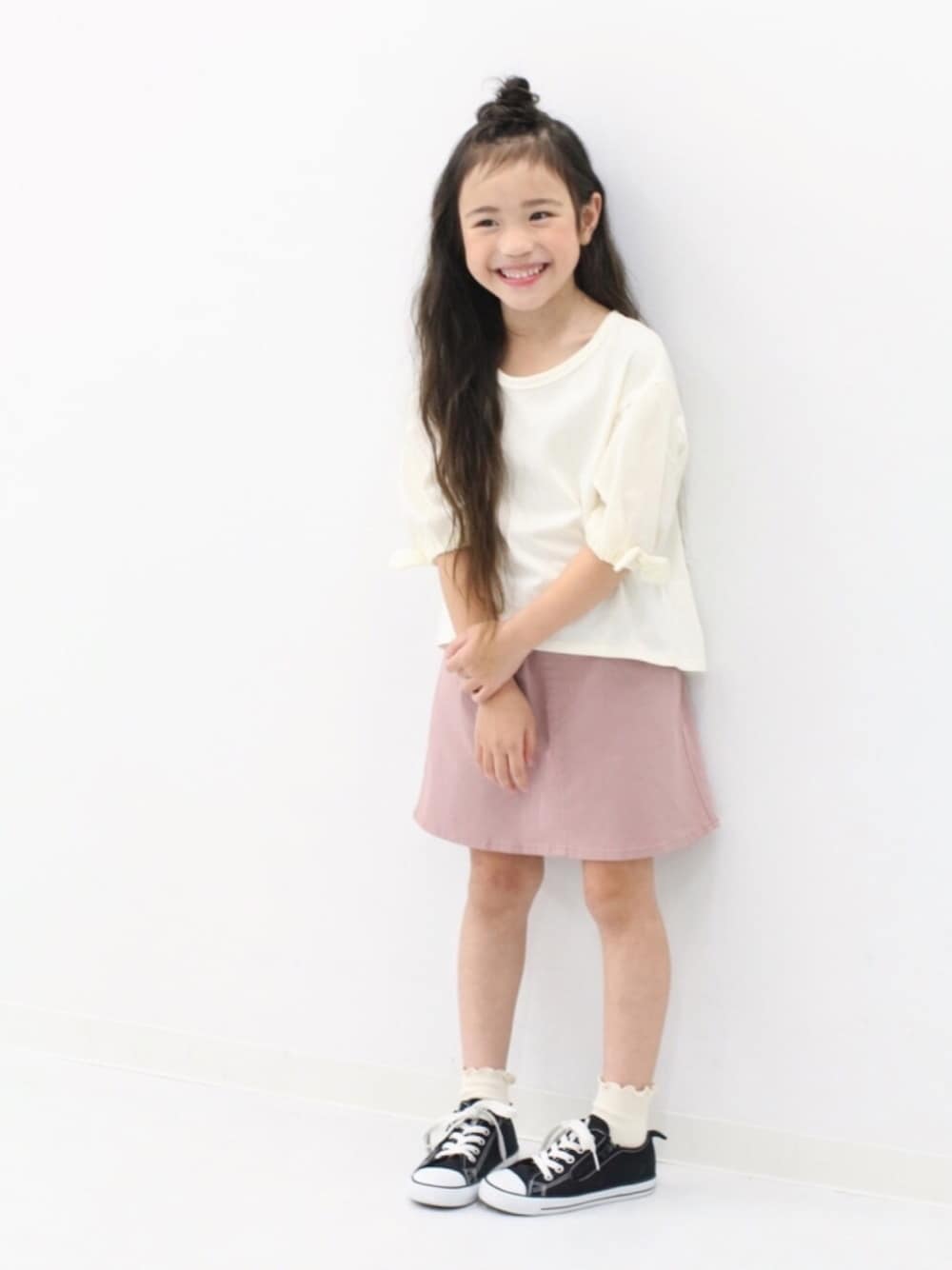 こんばんは🙌🏻 先取り春色コーデ☻ 新色 スモーキーピンクのスカートが 超絶かわいいです、、♡ もうすこし先の販売ですが、お楽しみに🥰 モデル身長:116cm 着用サイズ:120cm
