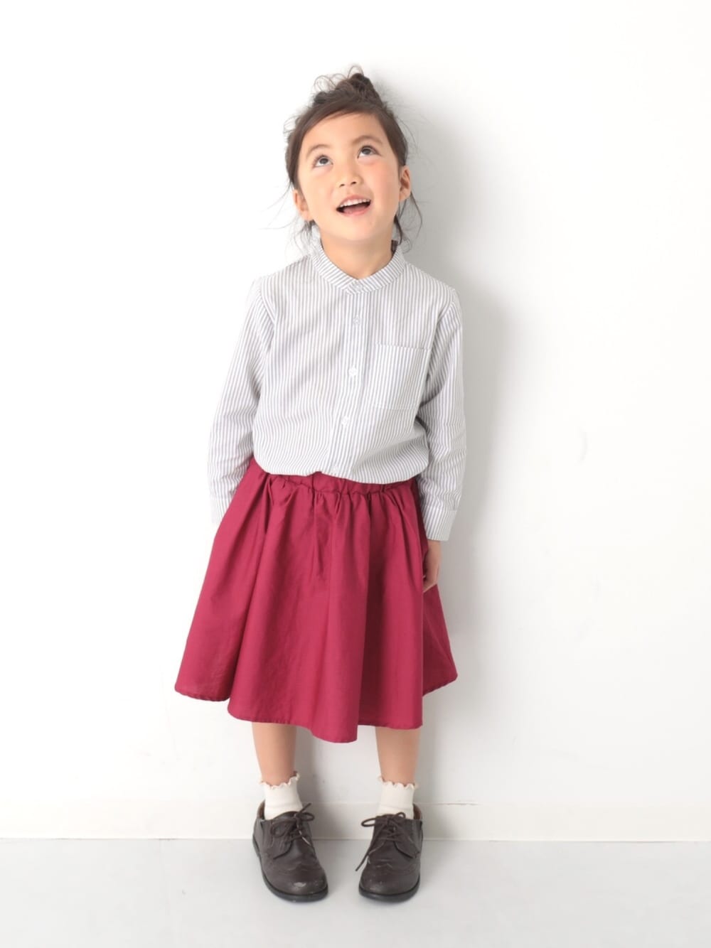 こんばんは🙌🏻 カジュアルからきちんとスタイルまで 幅広く活用できるノーカラーシャツ☻ 裾がラウンドになっているので カラートップスをサイドから ちら見せさせるのもおすすめです◎ モデル身長:108cm 着用サイズ:110cm