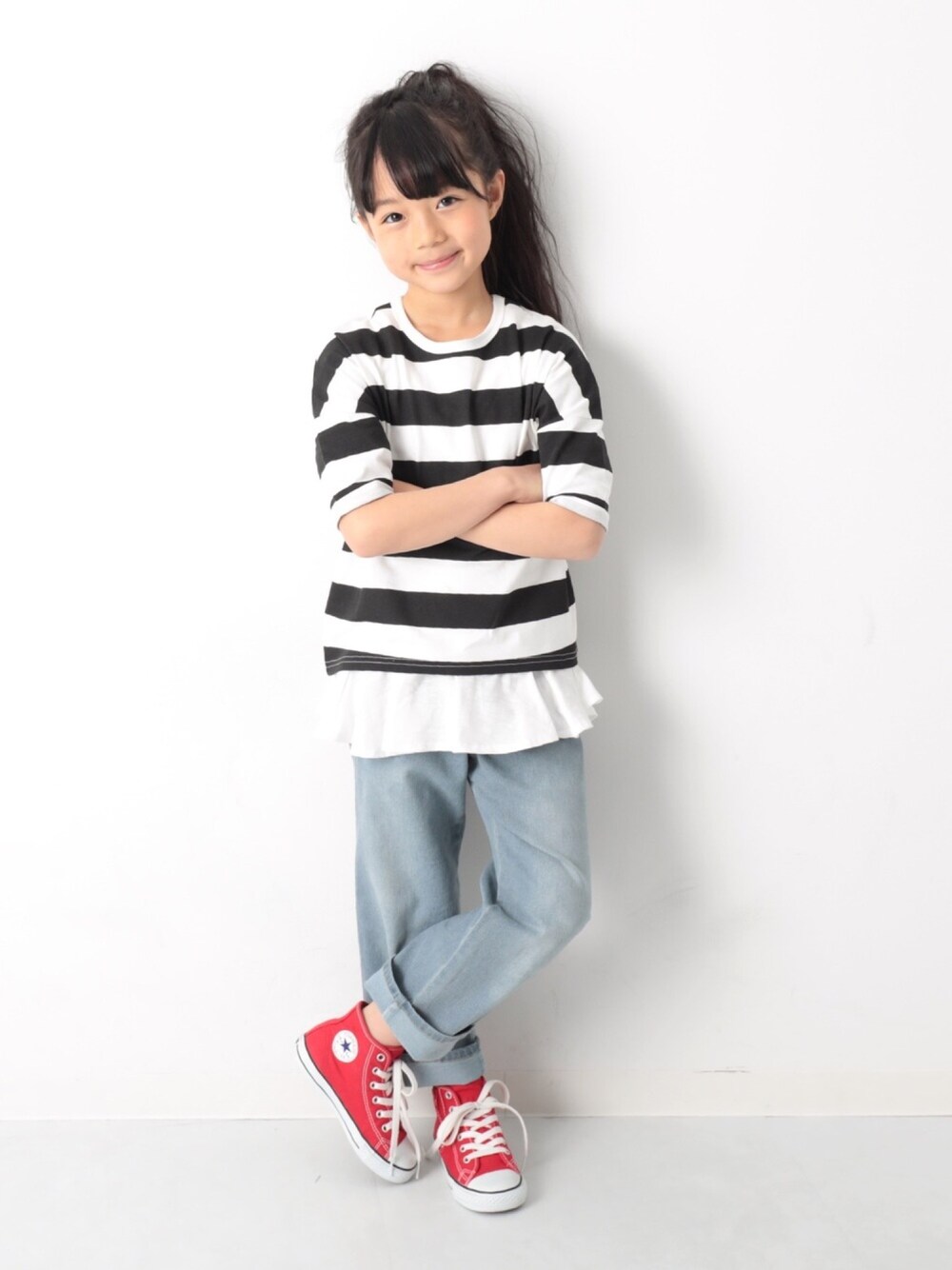 こんばんは🙌🏻 昨日up分の、ボーダーver😊 トップスは同じシルエット✌︎ ポニーとハイカットの赤コンで がらりと印象が変わってボーイッシュに🤤 ボーダーTeeはただいま ARIGATO会員 感謝セール中です♡ モデル身長:123cm 着用サイズ:120cm