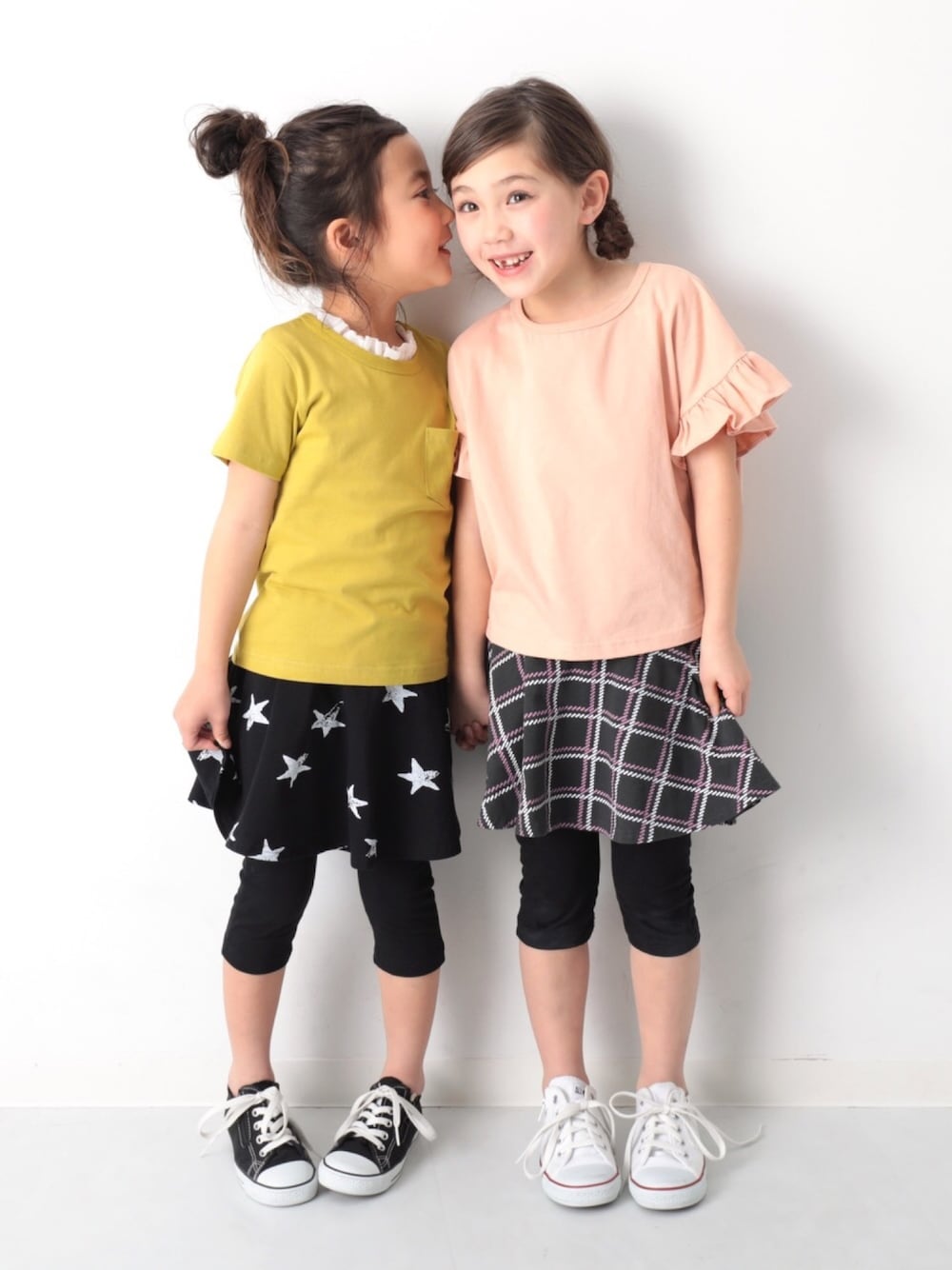 こんばんは🙌🏻 🗣撮影裏側ばなし よくあるひそひそ話カット、、☝︎ 実は、なぞなぞクイズの答えの 相談しあいっこをしています🥳 なぞなぞがだいすきなみんな☺️ トップスは淡いカラー&フリルで統一、 お好みの柄を選んだスカートリンクも◎ left モデル身長:109cm 着用サイズ:110cm right モデル身長:117.5cm 着用サイズ:110cm