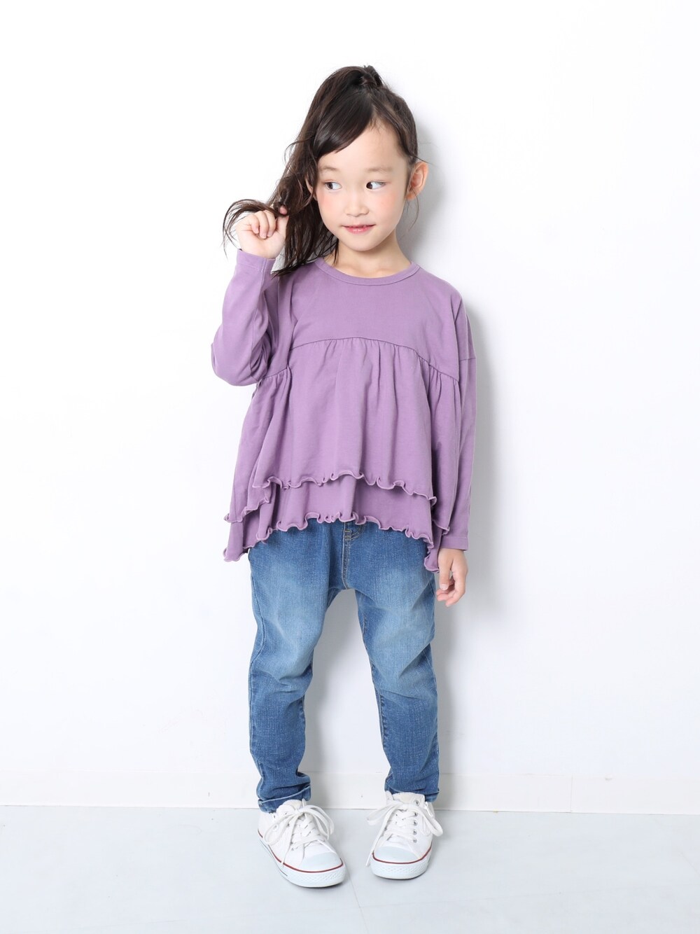 こんばんは🙌🏻 1枚でボリュームたっぷりのギャザーロンT😌 見頃もゆったりとしているので ギャザーの落ち感も絶妙です♡ モデル身長:110cm 着用サイズ:110cm