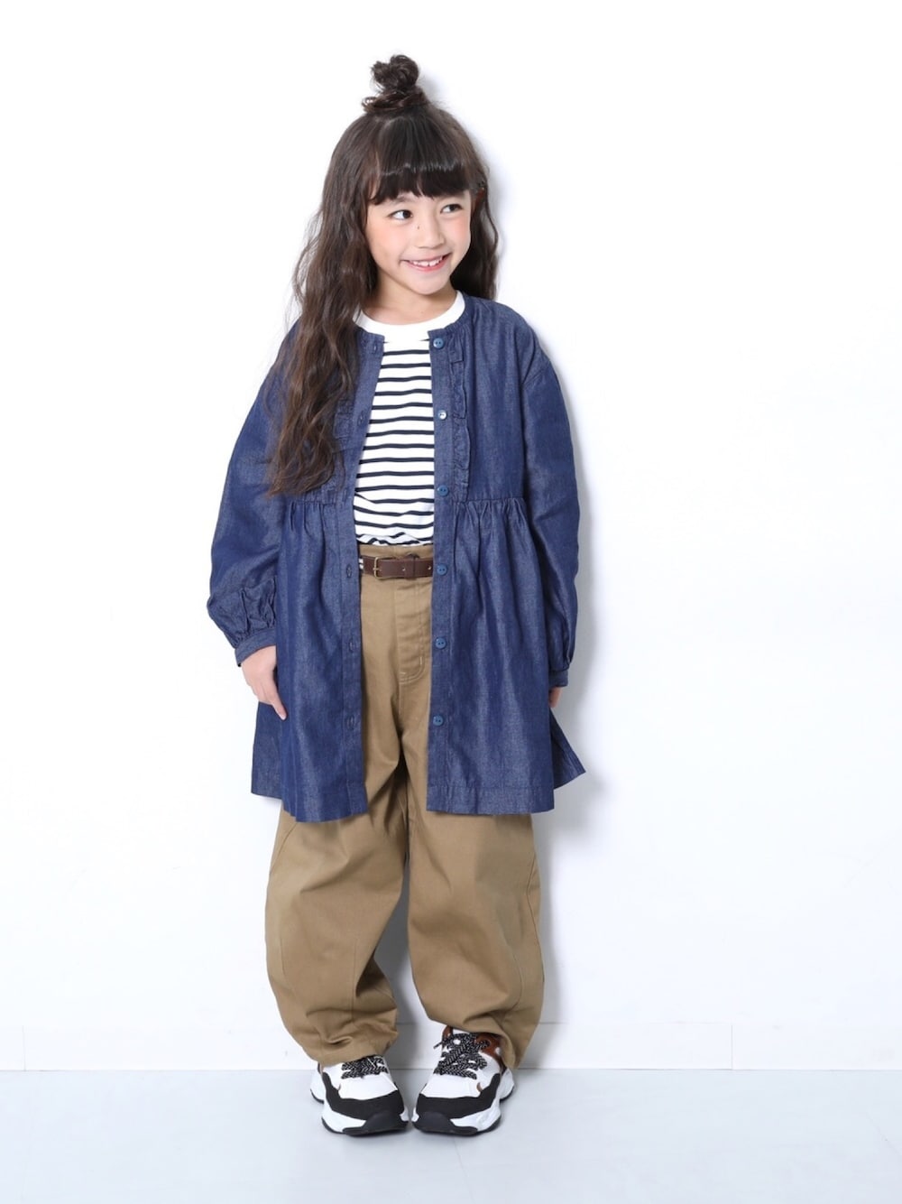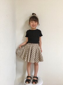 こんばんは🙌🏻 女の子らしいフリルのデニムワンピを ヒザデルパンツでカジュアルダウン😌 1枚でも使えるので 着まわし力ばっちりな優秀アイテムです✌︎ モデル身長:118cm 着用サイズ:120cm