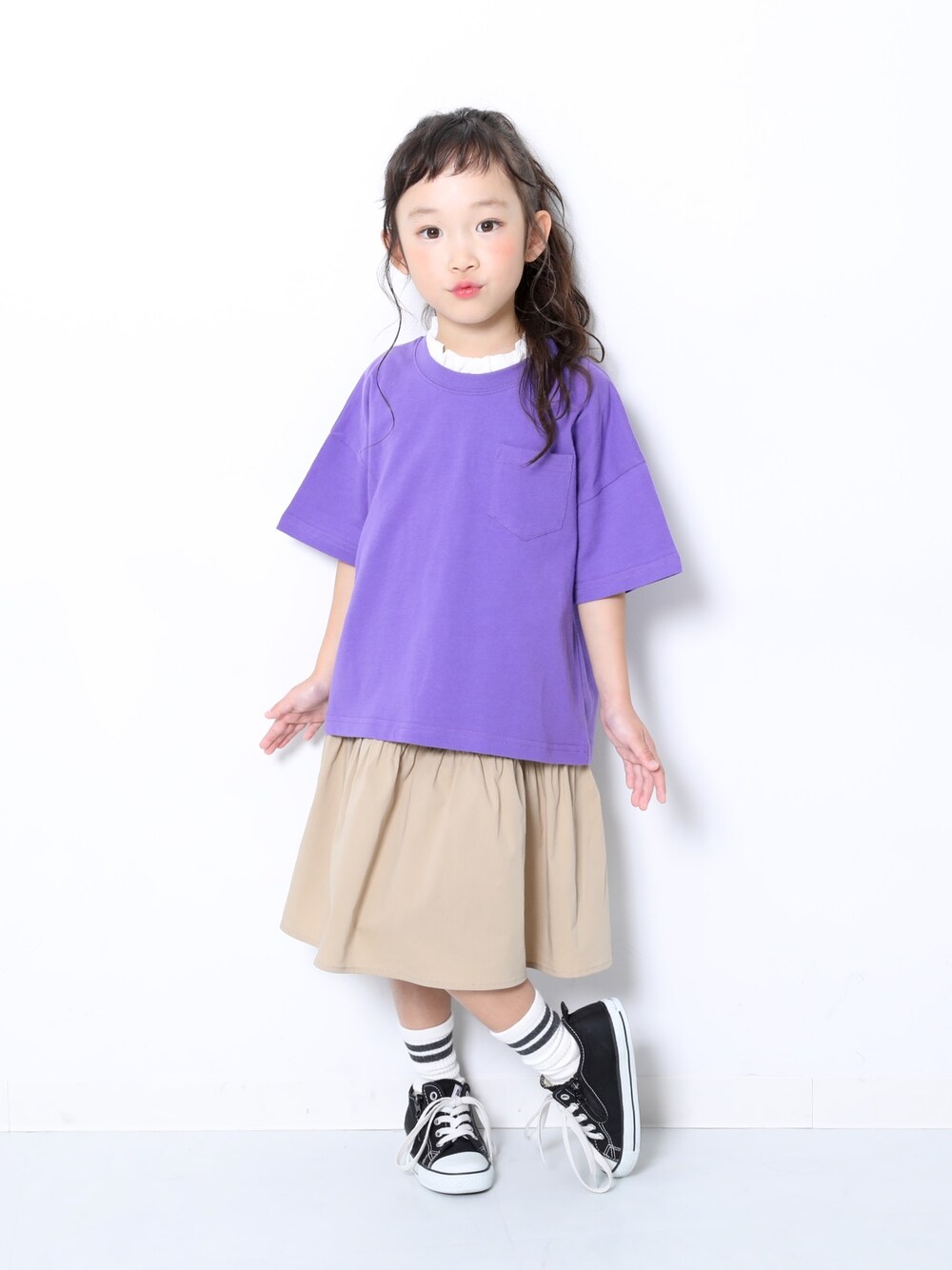 こんばんは🙌🏻 女の子にもおすすめの新色バイオレット🥳👏🏻 バイオレットが映えるベージュのスカートと☺️ モデル身長:112cm 着用サイズ:110cm