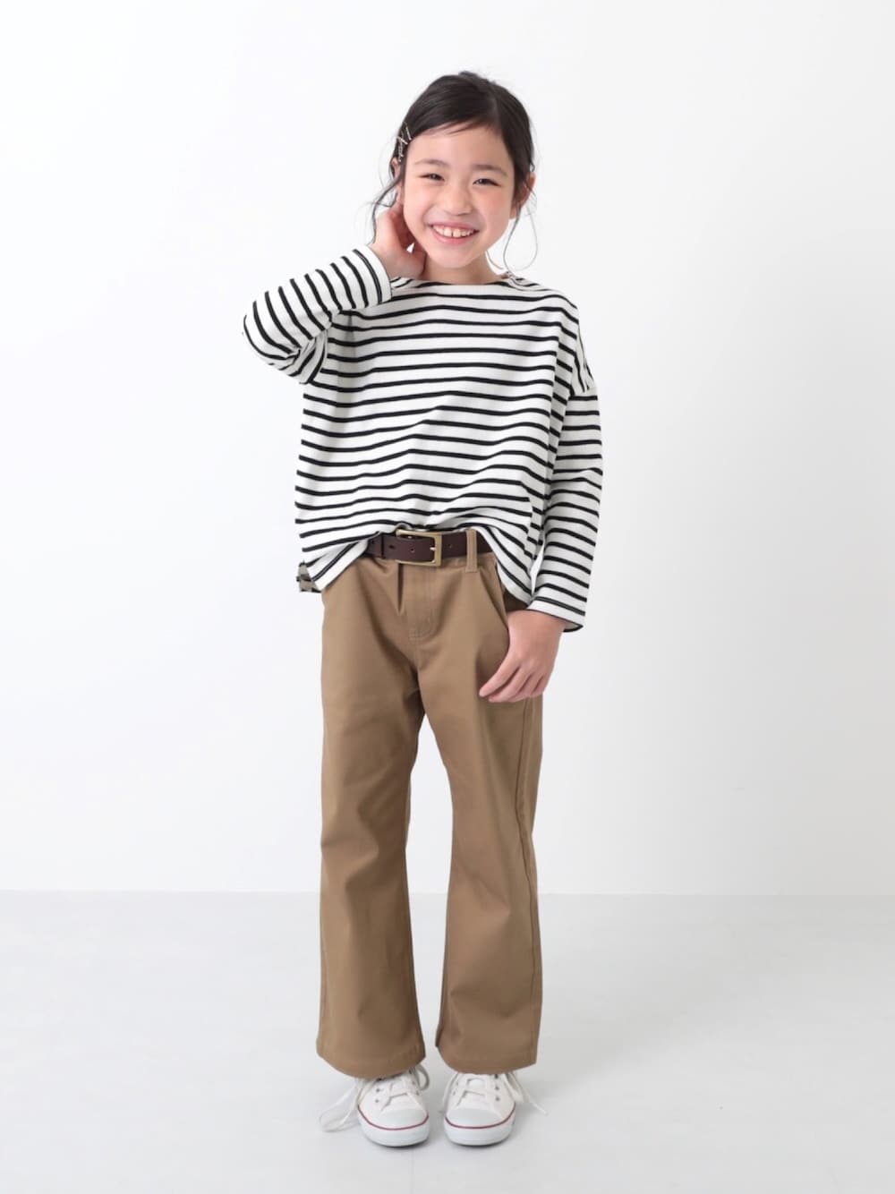 こんばんは🙌🏻 シンプルだけど大人っぽい😊 絶妙なピッチのボーダーロンTeeは 1枚あると便利◎ サイドにスリットがはいっているので タックインもしやすくなっています✌︎ モデル身長:125cm 着用サイズ:120cm