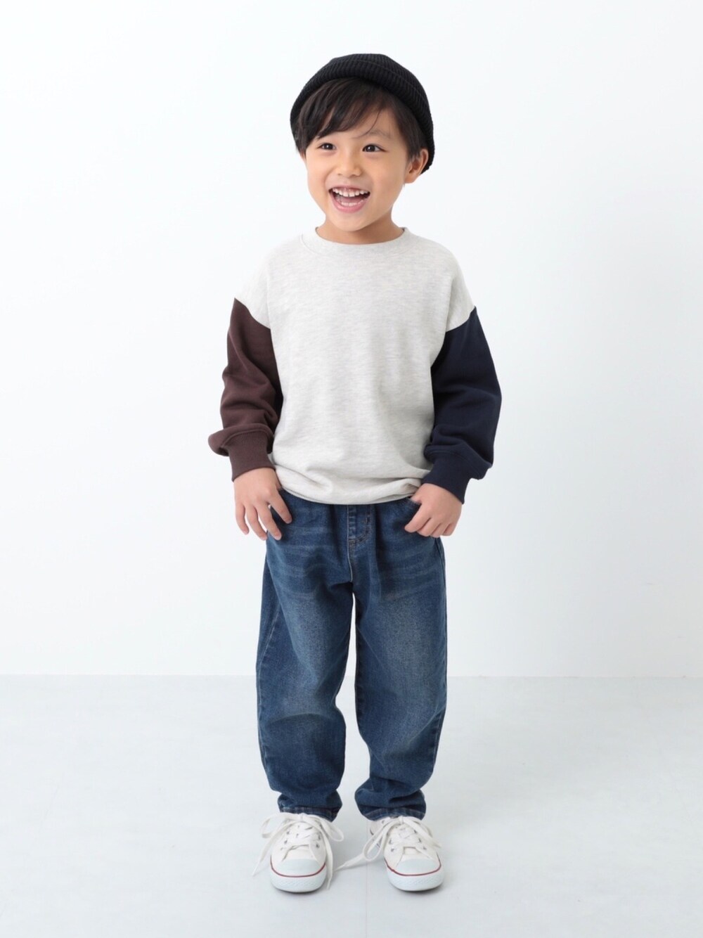 こんばんは🙌🏻 袖配色トレーナー😌 個性的だけど、落ち着いた色味なので ナチュラルな印象に✌︎ ゆるゆるっと着るのがおすすめです♡ モデル身長:109cm 着用サイズ:110cm
