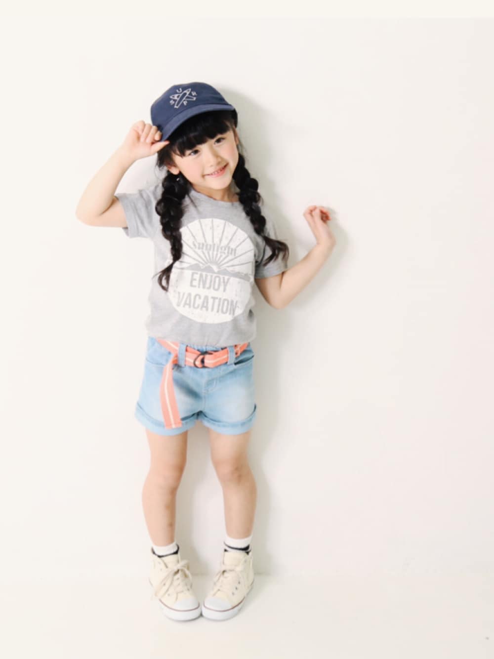 girlsカジュアルコーデ👑 ブリーチカラーのショートパンツに サーモンピンクのベルトが映える☺️♡ ゆるく編んだみつあみ × キャップが カジュアルさをup☝︎☝︎♫