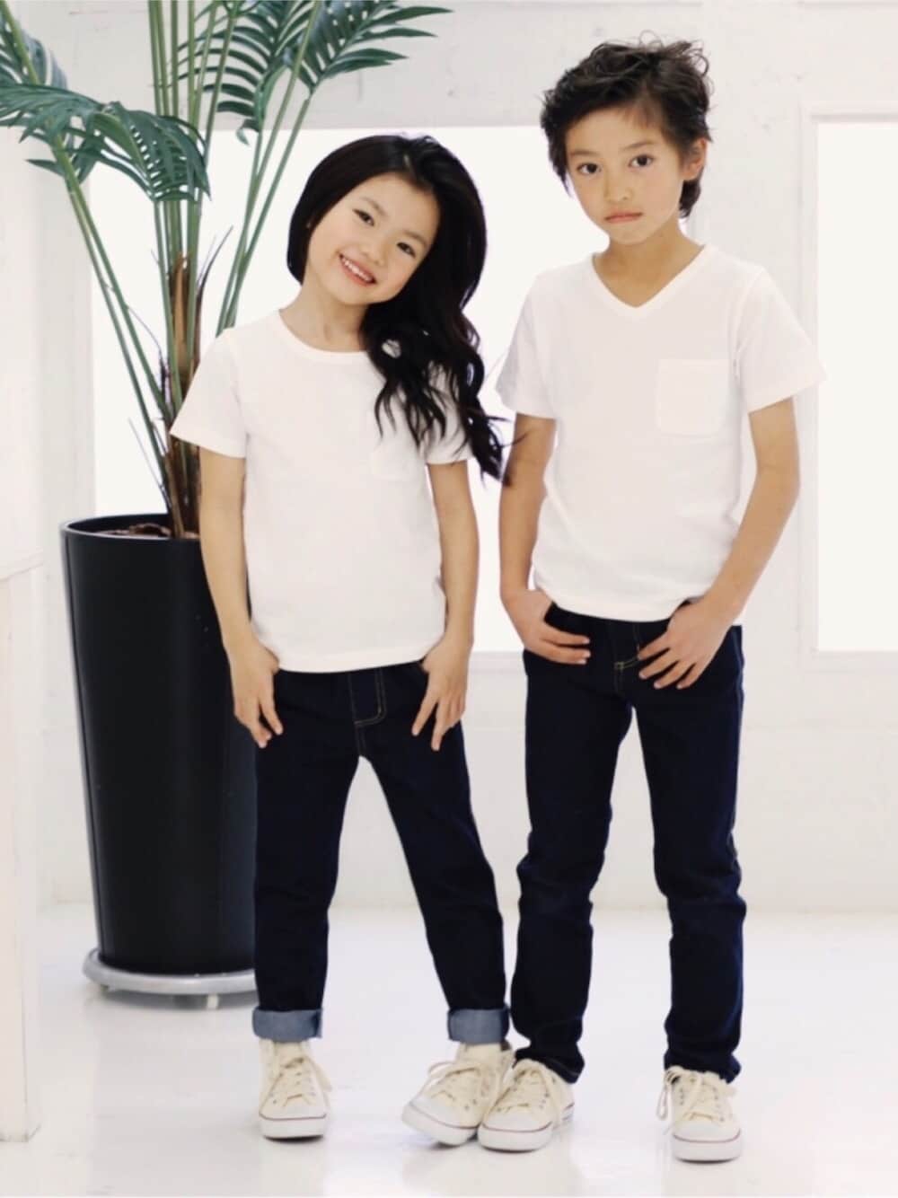 こんばんは🙌🏻 ホワイトの無地T × デニムパンツ 究極のシンプルスタイル クルーとVネックでリンクコーデ☻ おとこのことおんなのこのリンクも めちゃめちゃかわいい♡ ヘアスタイルは大人っぽく✌︎