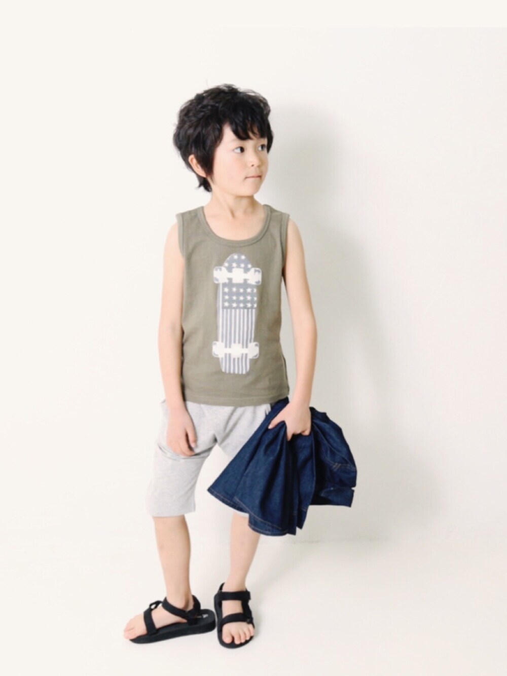 おはようございます🙌🏻 タンクトップにハーフパンツで超夏スタイル🏖 カーキにグレーの存在感のある スケボープリントがすごくツボ☺️♥️