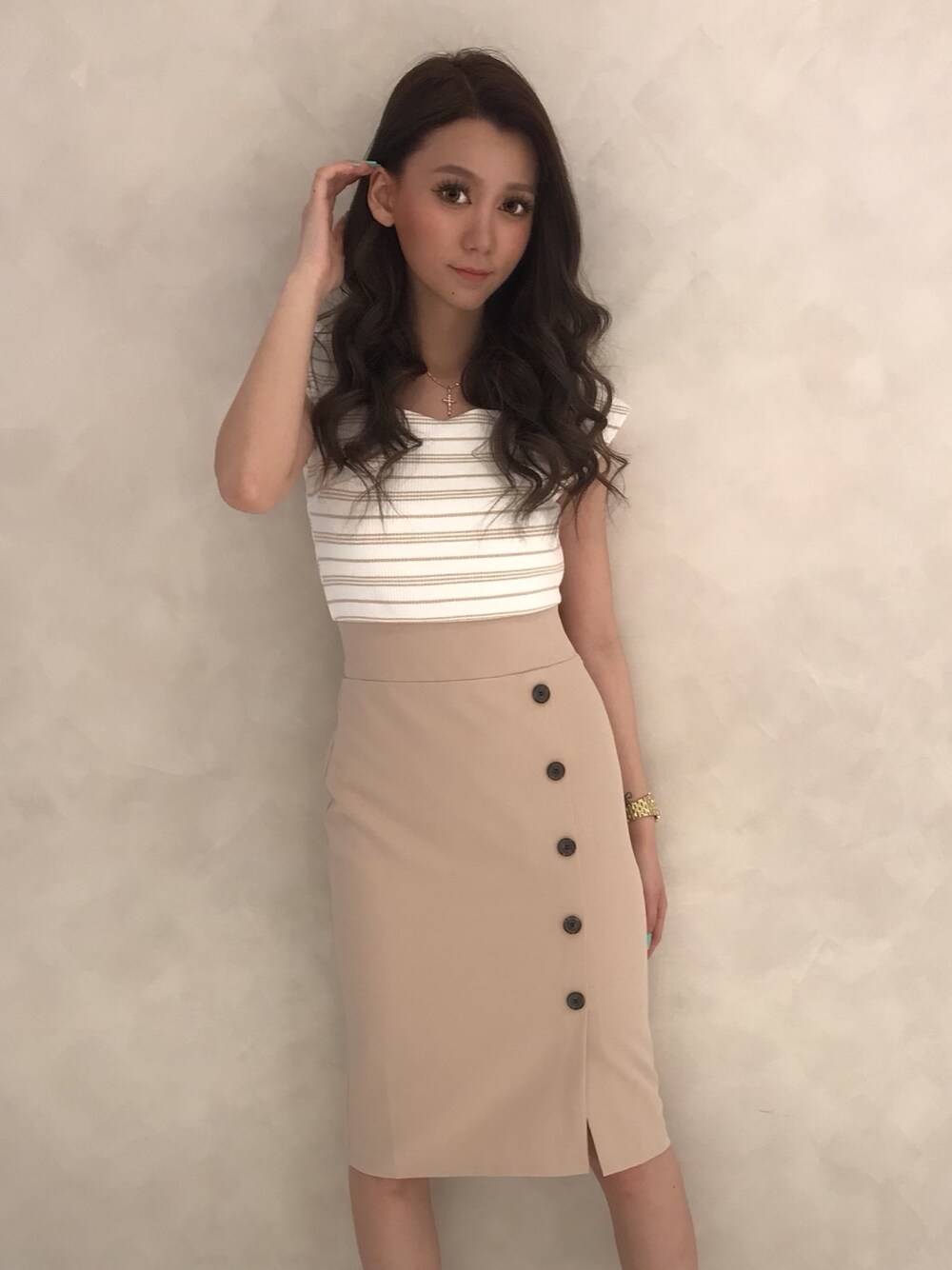 Delyle NOIR♡Rioのワンピース「ハートネックボーダーボタンタイトワンピース」を使ったコーディネート