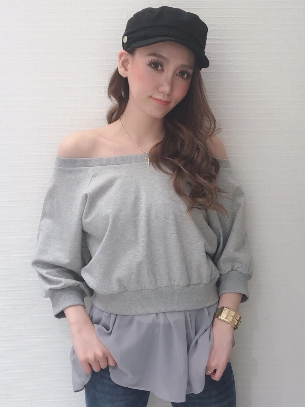 Delyle NOIR♡Rioのスウェット「シフォンドッキングワンショルダースウェットプルオーバー」を使ったコーディネート