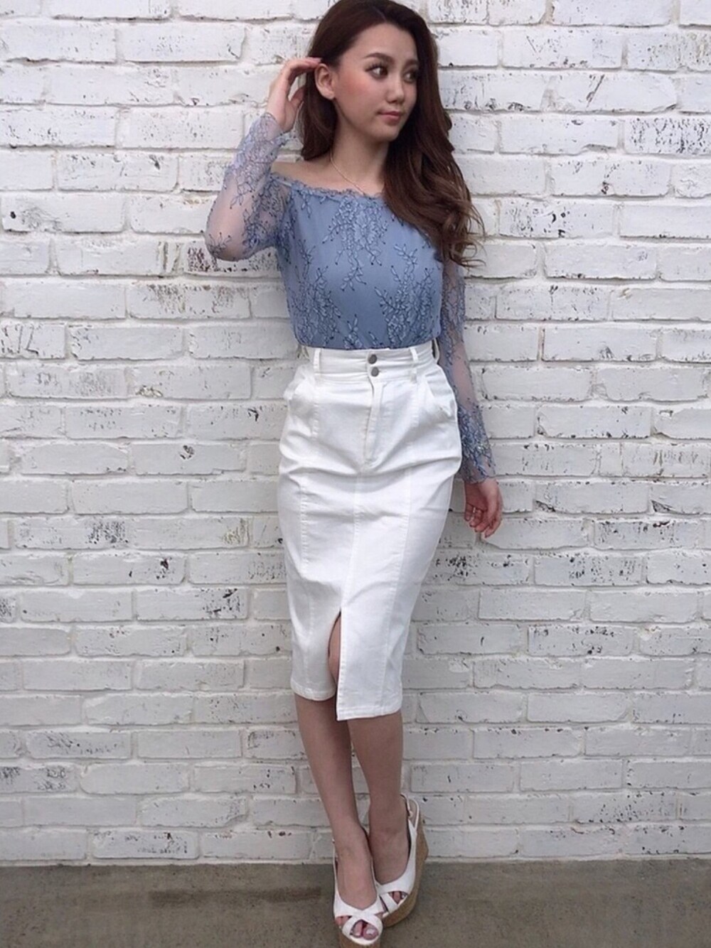 全体がレースになっていて袖の透け感が可愛いトップスです♡オフショルなので肩を綺麗に見せます✨
