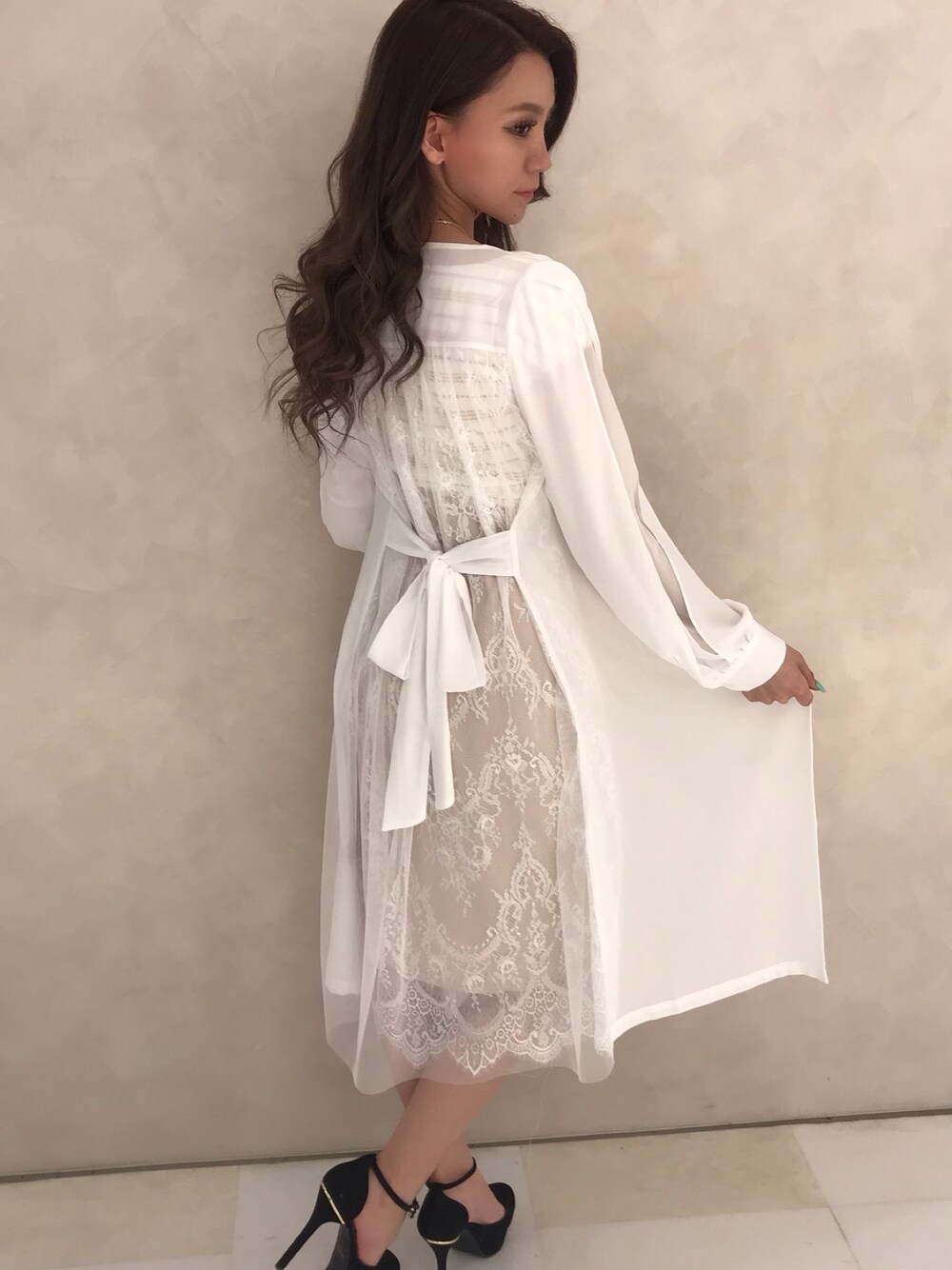 Delyle NOIR♡Rioのカーディガン/ボレロ「バックレースシースルーロングガウン」を使ったコーディネート
