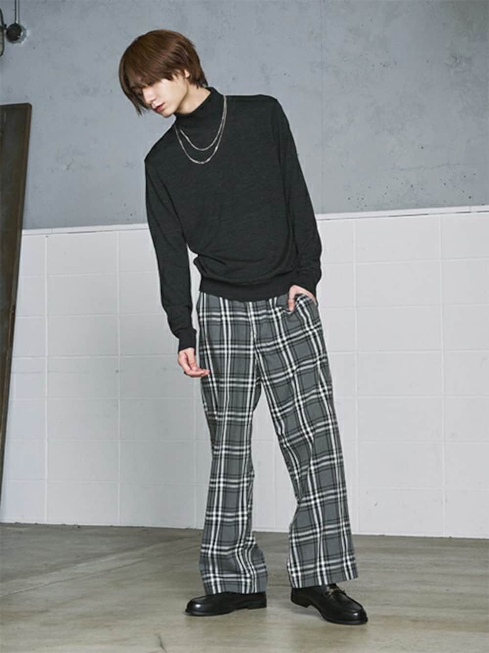 チェックパンツで作るモノトーンコーディネート。 今季人気の緩めのチェックパンツにAラインシルエットを意識してモックネックをトップスへ。 長めのネックレスが良いアクセントになっています。