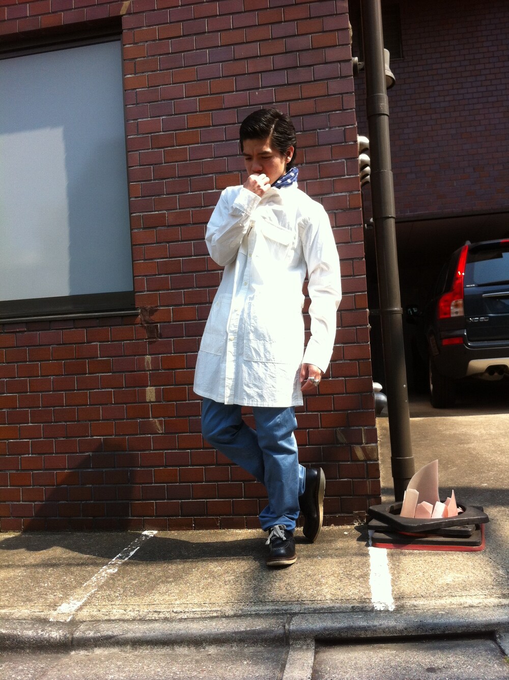 ホワイト系のシャツ/ブラウス、ブルー系のストール/ショールを着用したメンズの春コーディネートの1枚目の写真