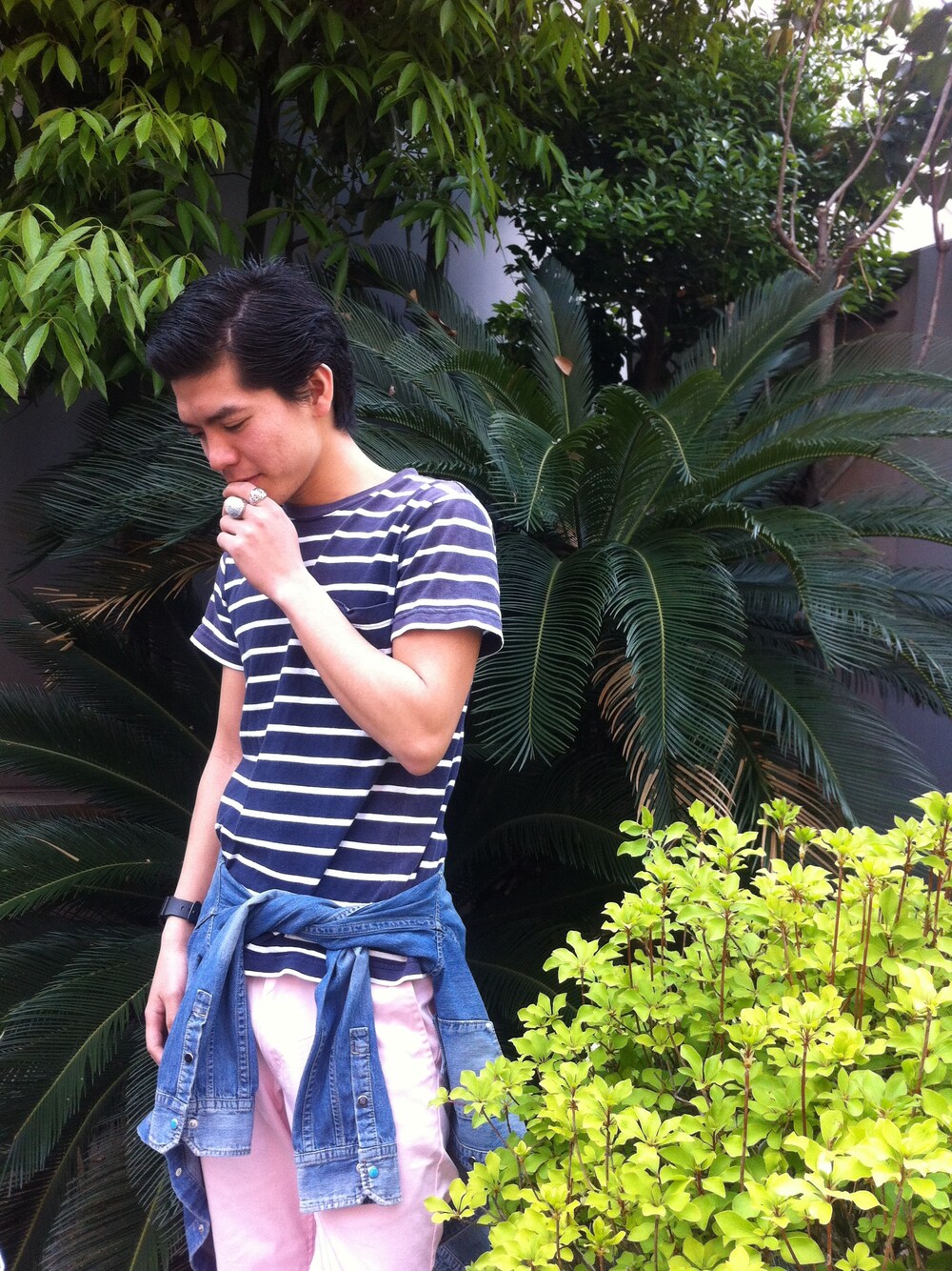 腰巻き×ハーフパンツ×ボーダー。 街中にある背景でリゾートっぽくなりました。 TETEHOMME デニムシャツ TETEHOMME ハーフパンツ