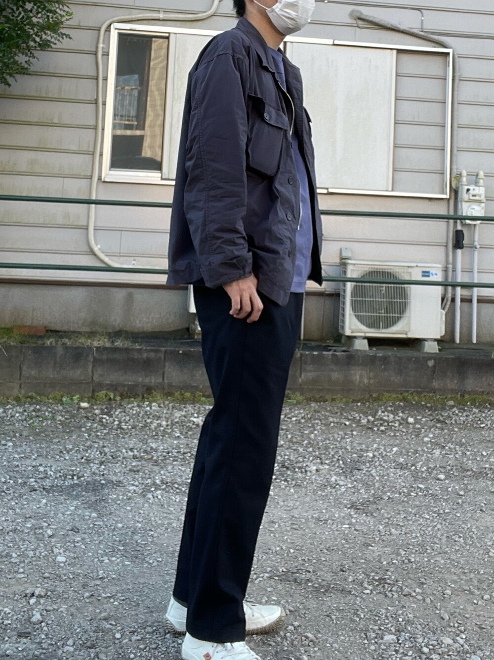 全身ネイビー系の色味で秋冬っぽくないコーデ笑 +Jのウールブレンドイージーパンツが思ったよりシルエット良くて購入しました、サイズはSでネイビー(黒に近いネイビー笑) ニットジップ欲しかったな……😞