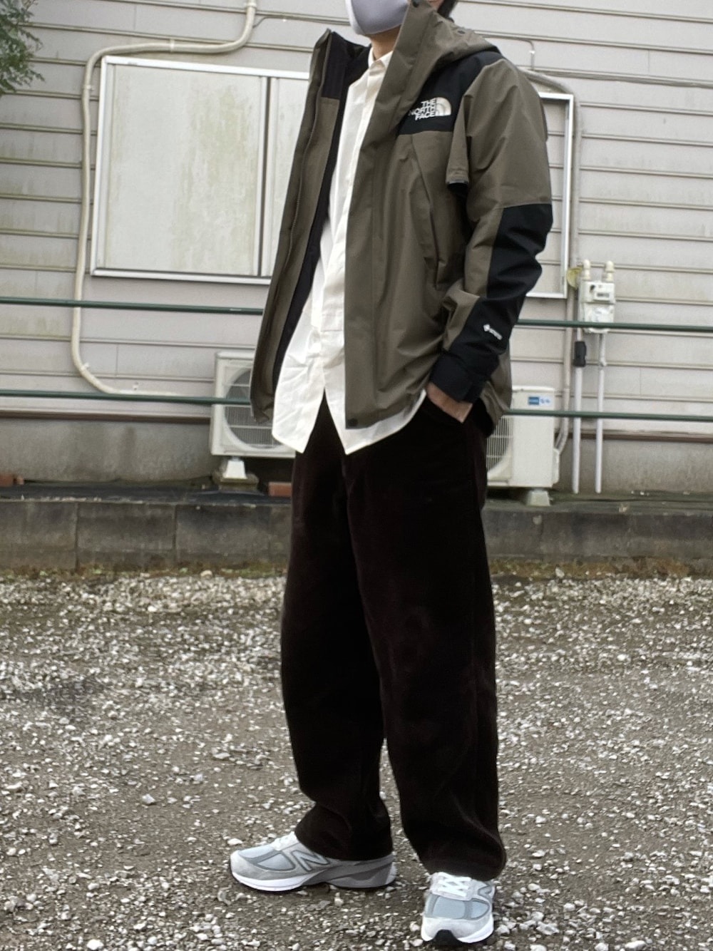 ノースフェイスのマウンテンジャケット +ジェイのスーピマコットンオーバーサイズシャツ UNIQLOUのコーデュロイワイドワークパンツ 全体的にブラウン系のアースカラーになりました笑