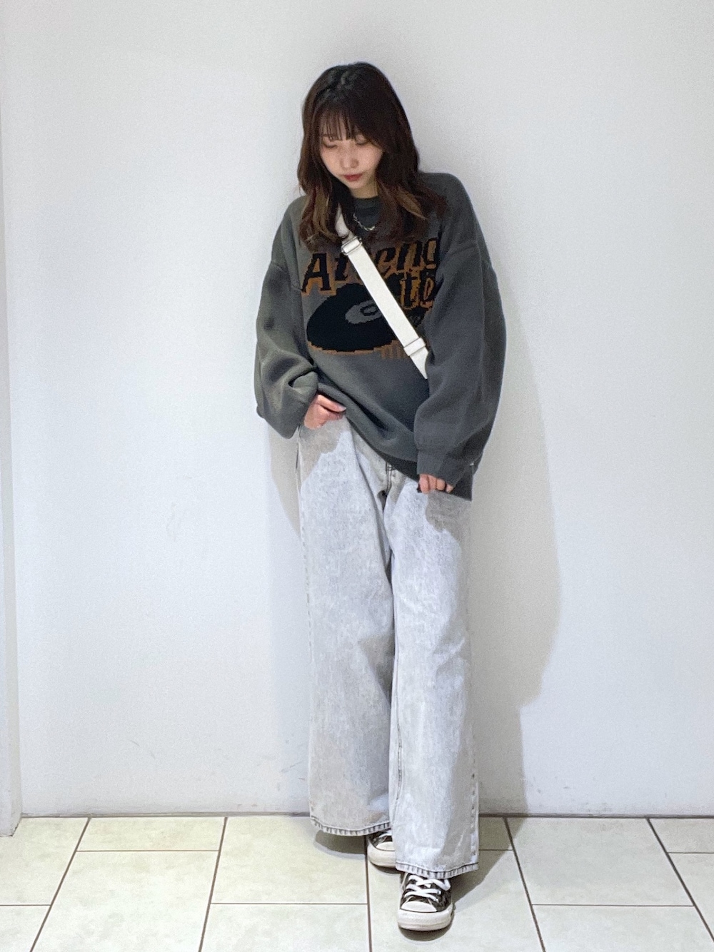 メンズライクコーデ💿👖 LIMのニットはロゴに淡めのカラーを使用しているため春らしい印象になります🌸ぽたっとしたボリューム袖とゆるゆるなサイズ感が今年らしく印象になります!生地ももちもちとしておりずっと着ていたくなるような素材です☺️ COREのデニムは自然に広がるワイドめなフレアシルエットなので足の華奢見えが叶います!!丈が長い場合はロールアップしても履けるので小柄さんも安心です!ホワイトグレーは褪せた感じこなれた色味でモードからカジュアルまで幅広く合わせて頂けます✨ あえてルーズなトップスと合わせただぼだぼスタイルお気に入りです♡