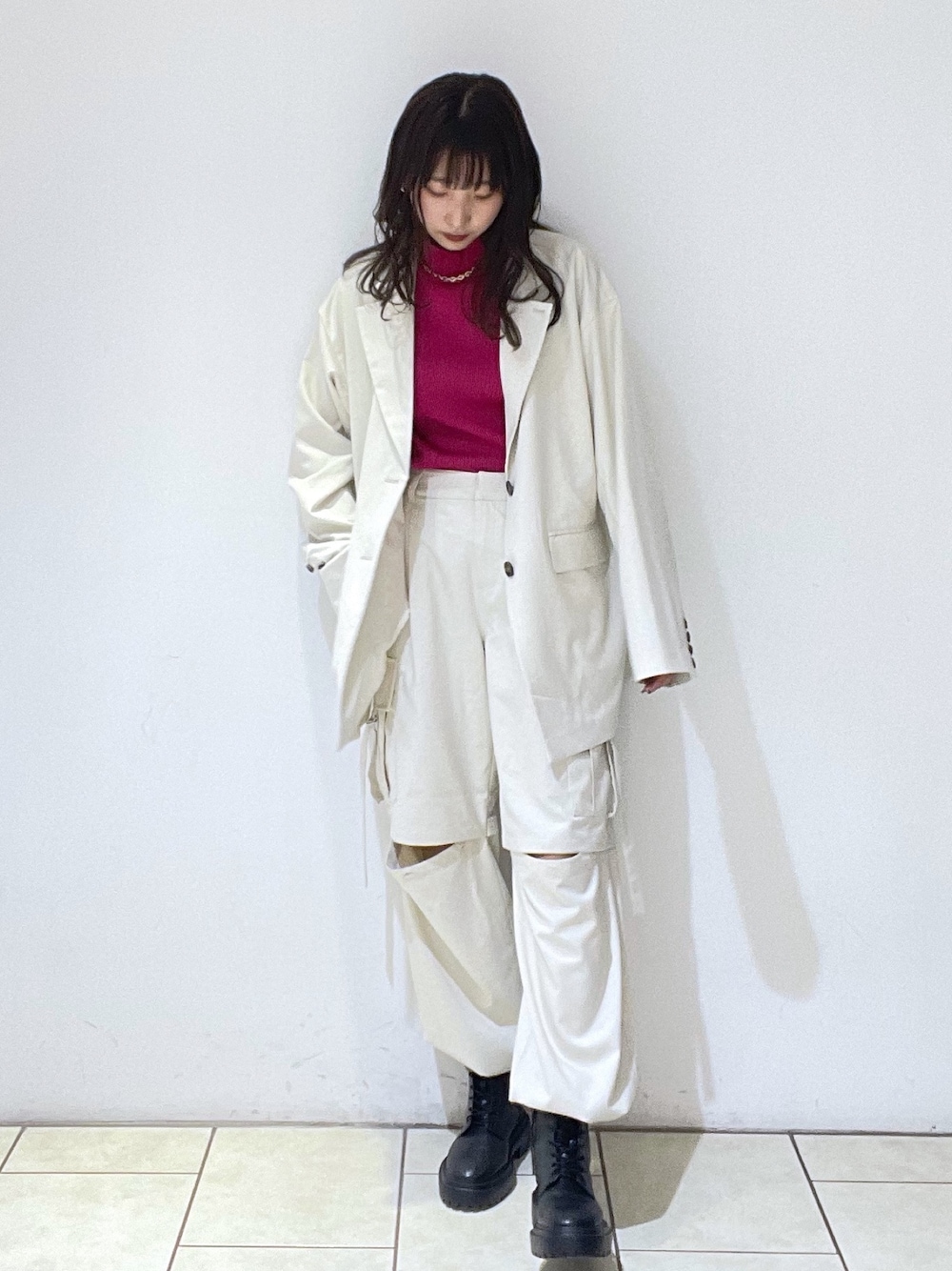 春色セットアップコーデ💐💞 ジャケットはボックスシルエットが綺麗すぎて羽織った瞬間感動でした…✨丈は長めですがすっきりとしたシルエットになっており、デイリーにもフォーマルにも使いやすいアイテムです👏さらっとした生地感で、インナーを変えるだけでオールシーズン使えるのも嬉しい☺️☺️グレージュの色味はかちっとなりすぎず、こなれ感を出してくるのでおすすめです🫶 パンツは前膝の部分をスリット使用にできるデザイン抜群なアイテム!一般的なカーゴパンツはカジュアルな印象になりがちですが、ツイル生地を使用していることで大人モードな印象に仕上がります⛓ストレートシルエットでも履けるのでシーンに合わせてアレンジが効きます◎ 春らしいグレージュ×ピンクの組み合わせがお気に入りなコーデです🌸
