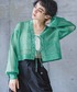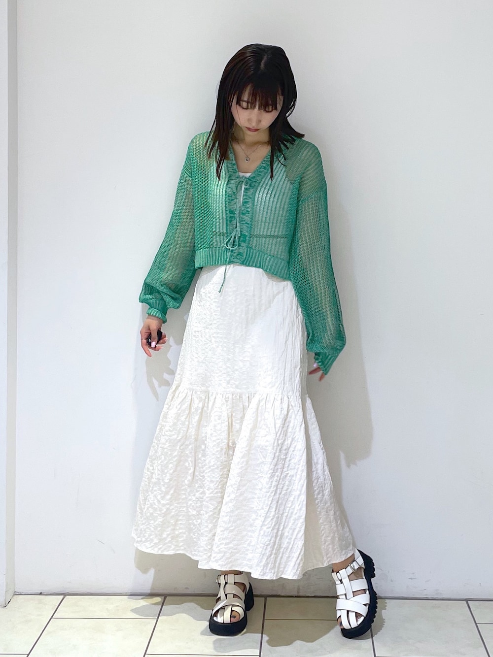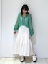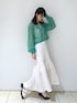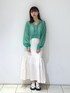 カジュアルガーリーコーデ🍈🤍 トップスは前のリボンをそのまま垂らして羽織としても使える優れもの👏網目が細かいのでヘルシーな肌見せが叶います✨手首の部分にゴムが入っているので腕まくりした時も落ちてこないのも嬉しいポイント!普段あまり着ないグリーンにチャレンジしましたが、白と緑の糸が混ざった生地なのでパキッとしすぎず合わせやすかったです◎ スカートはぽこぽこした表面感がトレンド感があって可愛い♡膝下あたりまで裏地もついているので安心して履いて頂けます🙆途中の切り替えから広がるデザインなので白でも膨張を気にせずにすっきりと履けます🙌甘めのトップスはもちろん、T シャツなどとのカジュアル合わせにももってこいなアイテムです🫶