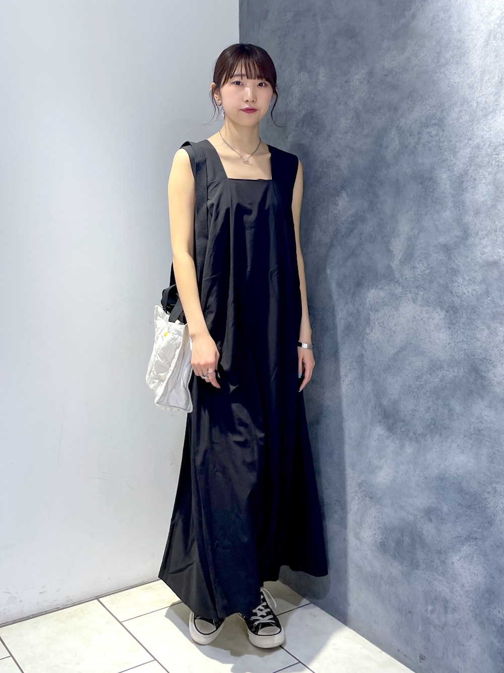 ジャンスカコーデ🤍🐆 ジャンスカは綺麗なAラインシルエットで身体のラインを拾いにくいのがありがたいアイテムです🎶S.Mでサイズ展開があり、164cmでMサイズ着用しております!ポケットも付いているので、ちょっとしたお出かけならこれ一枚で行けちゃいます◎ 首元はスクエアネックになっているのでデコルテ周り綺麗に見え、後ろはクロスのデザインなのでバックスタイルまで可愛いです👏一枚ではもちろんレイヤードコーデにもおすすめです✨ シンプルになりすぎないように存在感のあるバッグや柄物のスニーカーでアクセントを加えました🌟ぜひチェックしてみてください🙌