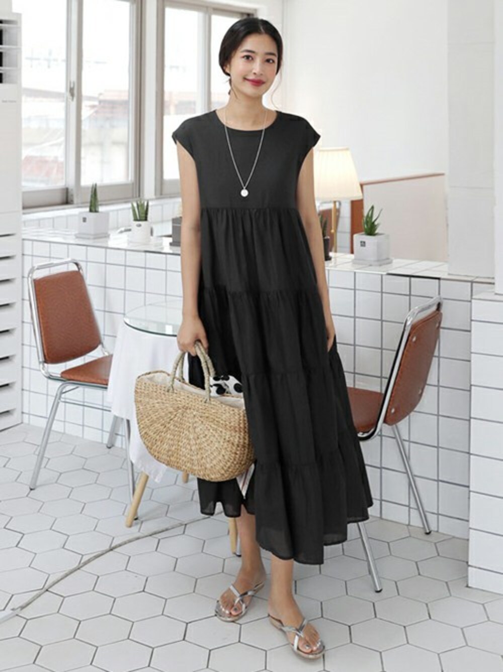 ディーホリックのワンピース「ギャザーフレンチスリーブロングワンピース」を使ったコーディネート