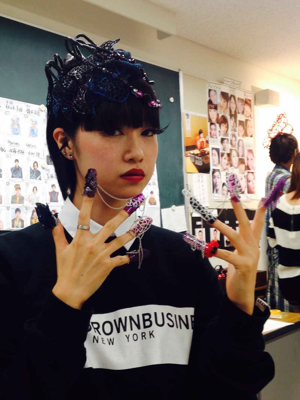 toxicのヘアメイク💜💜💜 見にくいけど、睫毛やアイシャドウ、ラインやリップが毒々しくて最高😂🙌✨ リップだけ変更になって、このカラーの上にブラックのラメ無しアイシャドウを口角側からグラデーションさせてホラーでセクシーにさせます💄✨❤️💜 ネイルリングも激しくてキュート😂👍✨🙌