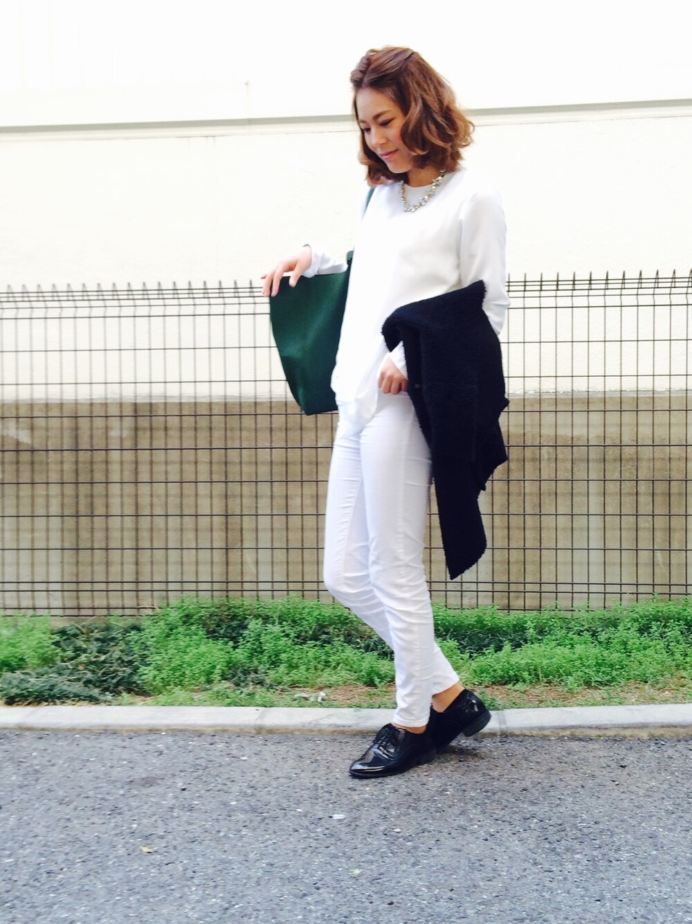 【モノトーンcode】 黒と白でまとめたスタイルに緑のトートバッグ おしゃれ感を出すためにごつめのネックレス
