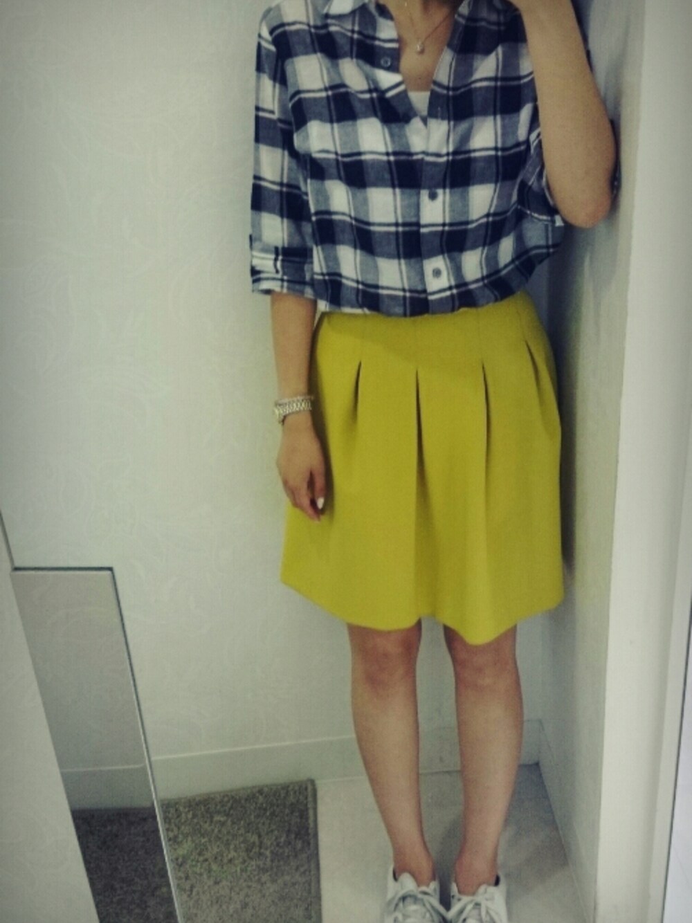 作業が多い予定の今日はコンバースで☆ 肌寒かったので麻混のチェックシャツに動きやすいフレアスカート whiteレザーのオールスター優秀ちゃん