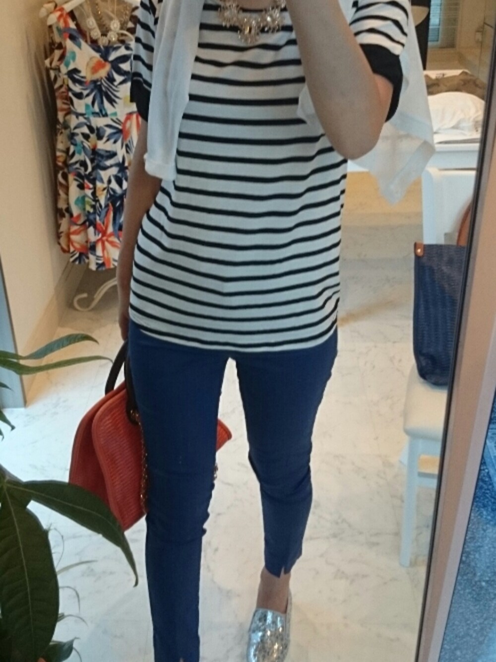 深いブルーのセンタープレスパンツ 前スリットが珍しい &スリッポン合わせでもスッキリ見えるのはラインの綺麗さとこのスリットのおかげ(o^-^o) さりげない大人な ひょう柄シルバーも素敵なのです☆