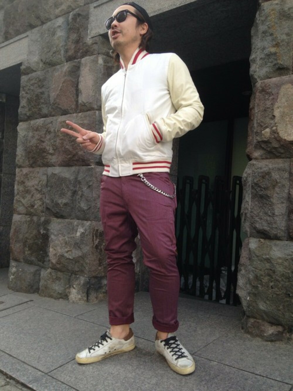 これからの季節にどハマりのアイテムを 合わせてみました。 軽めの春らしいスタジャンに合わせたのは、 ボルドーカラーのアンクルスキニー。 パンツの色味で大人をアピール。