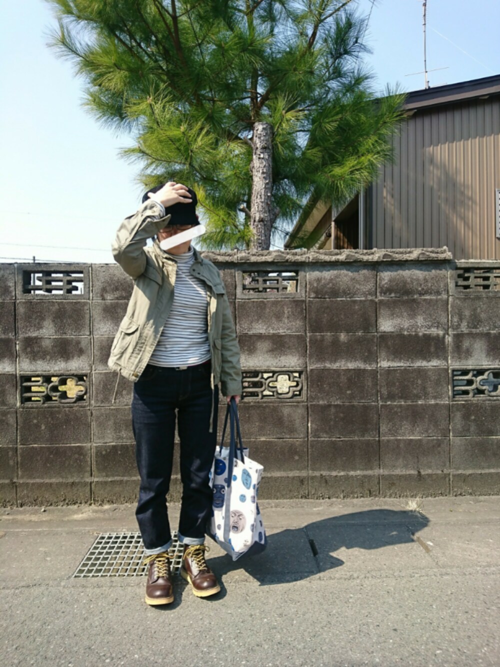 まだちょっと肌寒かった時のコーデ 久しぶりにレッド・ウィングのお手入れをしたので履いてお出掛け もう15年くらい履いているので、革がいい感じに気合いが入ってます(笑)