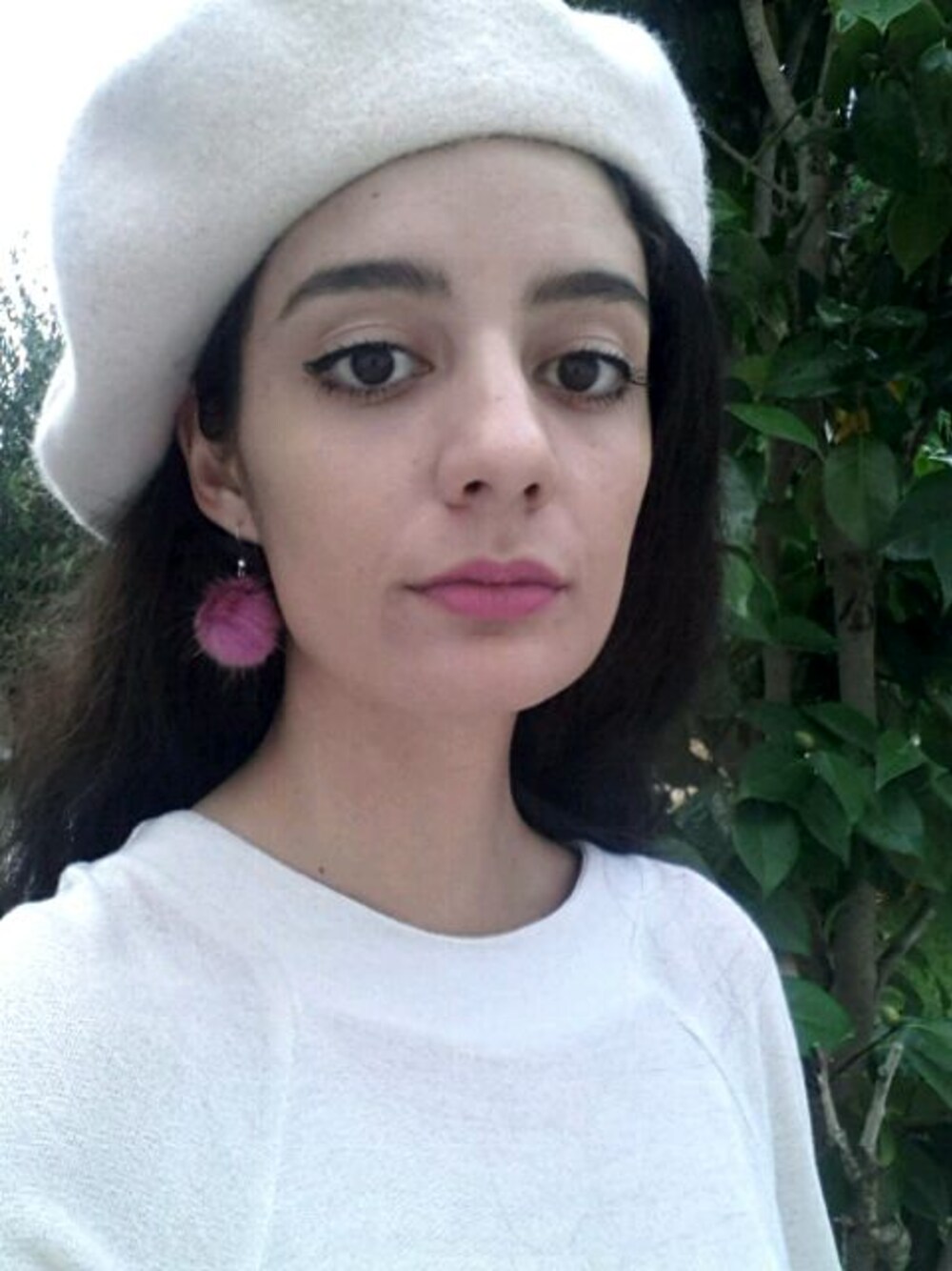 ホワイト系のベスト、ピンク系のハンチング/ベレー帽、パープル系のイヤリングを着用したレディースの秋コーディネートの1枚目の写真