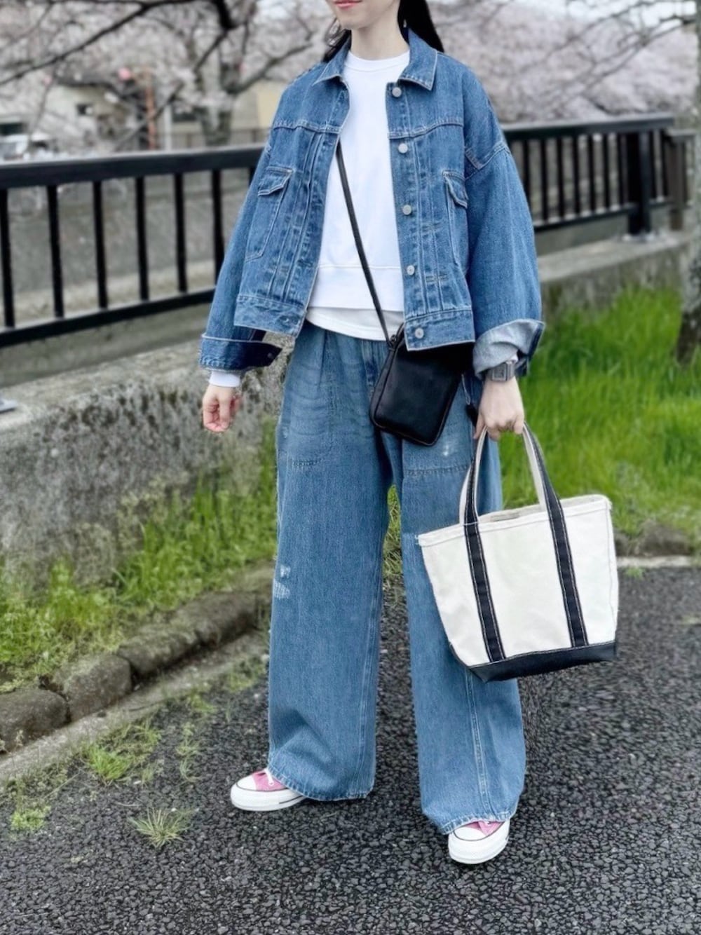 おはようございます𓂃𓐪𓐪𓐪 デニ×デニ 白×白レイヤード ピンクオールスター🩷 お花見コーデです🌸 instagram 𓃈 zua8dieu