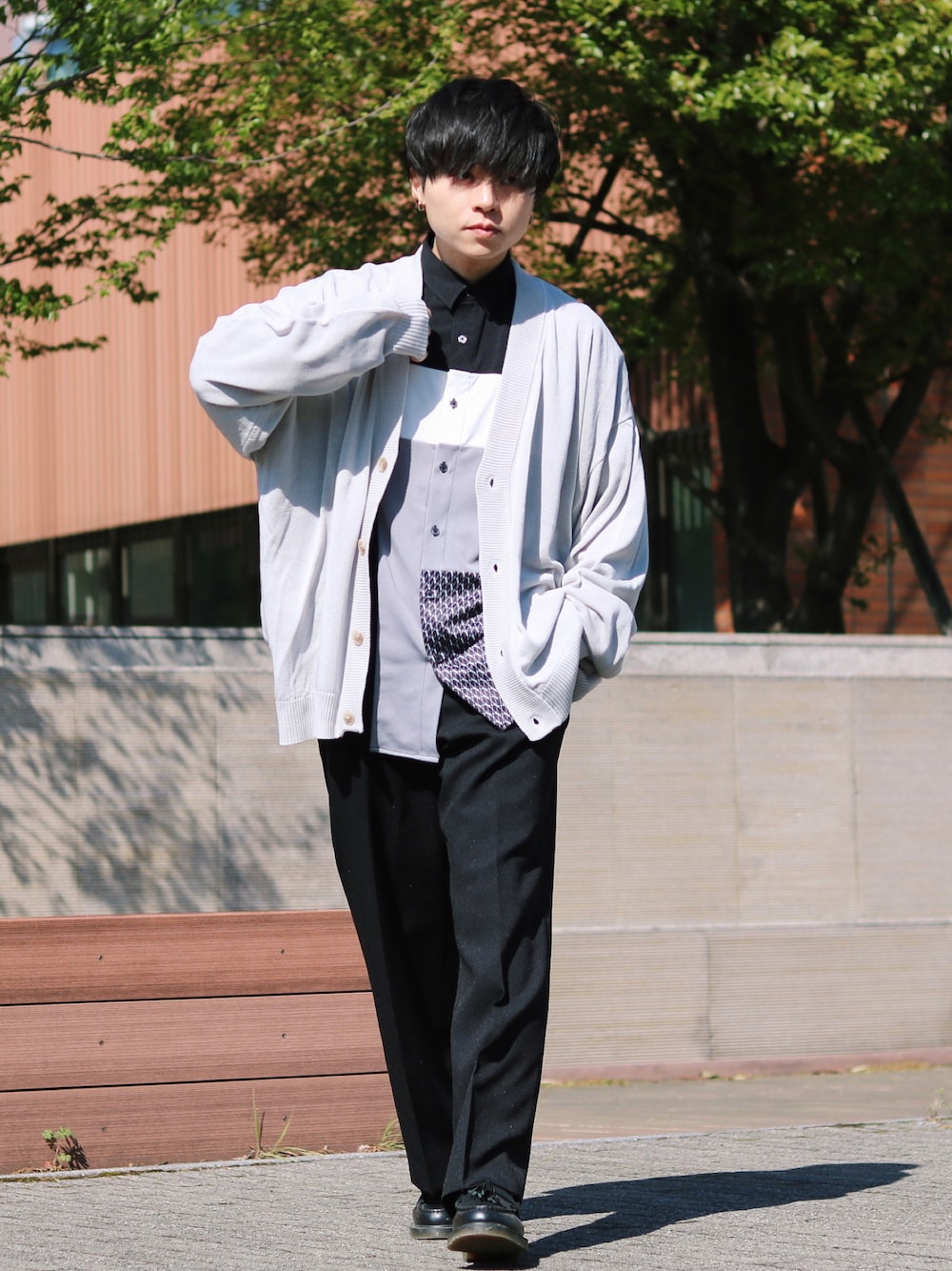 モノトーンスタイル🚶🏼♂️🚶♂️🚶🏼♂️ 大胆な切り替えシャツをインナーに合わせたコーディネート! 柄物抵抗ある方は上にカーディガン等無地のを合わせるのオススメです!