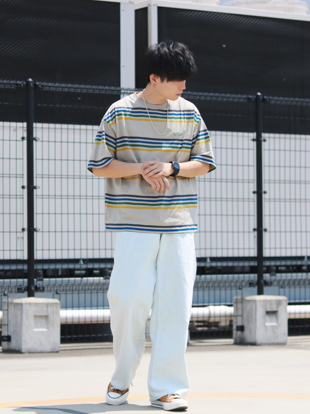 ボーダーTスタイル🚶🏼♂️🚶♂️🚶🏼♂️ 個性的なボーダーTで夏のカジュアルコーディネート! 胸元のロゴはバッジになっていて取り外し可能なのが◎