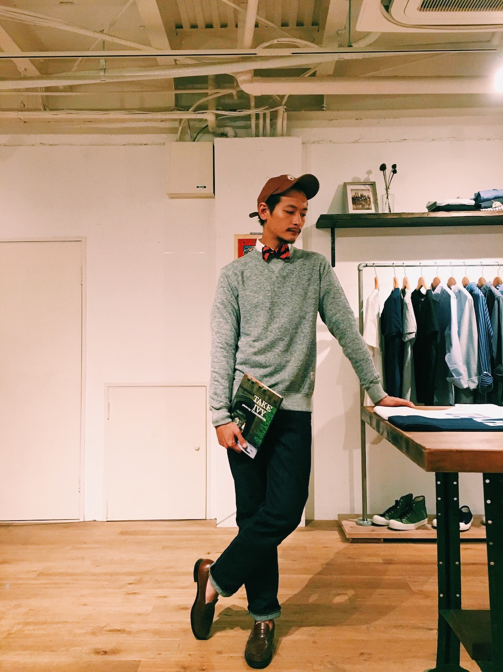 秋にぴったりな薄手のスウェットをベースに、ボタンダウンシャツ・細身のデニムで秋のIVYスタイルです。 これからの時期に使いやすいコーディネートかなと思います。