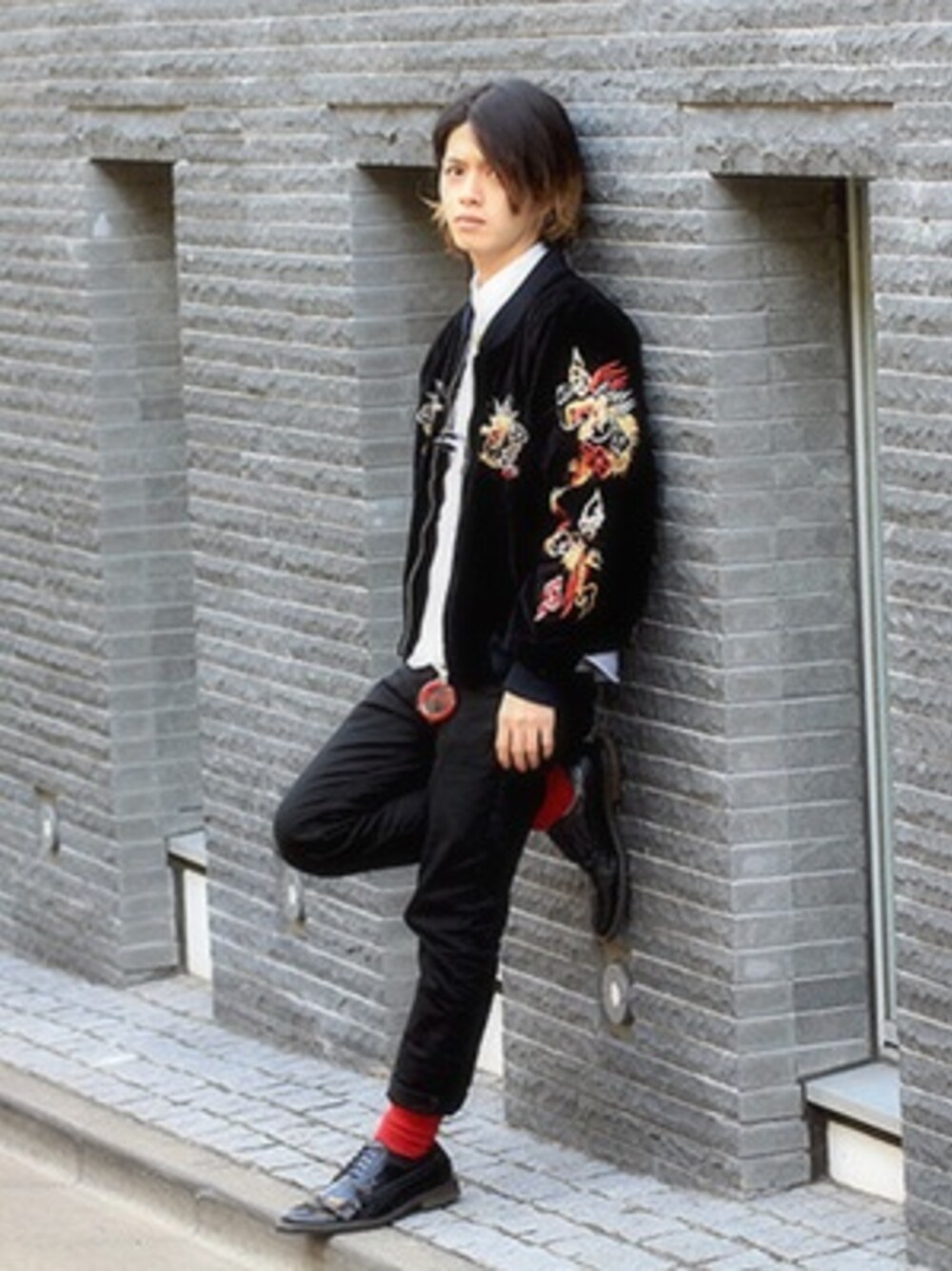 古着のスカジャンをメインに他はキレイ目にコーデしました。