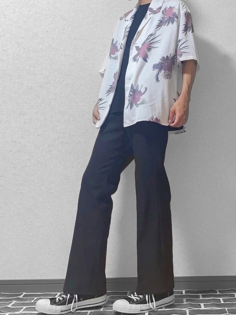 おはようございます!ダイキです☀️ いつもいいね、お気に入りありがとうございます! 今回は前回と同じパンツを使った着回しコーデです! このパンツはシューカットという作りのフレアパンツなのでスニーカーとめちゃくちゃ相性いいのが最高です🥳 コンバースも全部の縫い目に白ステッチが使われてるものなのでめちゃくちゃ可愛いんです😍 中に着ているTシャツはあえてパンツと同じブラックにすることによって柄シャツの存在感をアピールしてみました!! Instagramも不定期ですが更新しているのでよかったら覗いて行ってください! 最後まで読んでくださってありがとうございました! では🙌