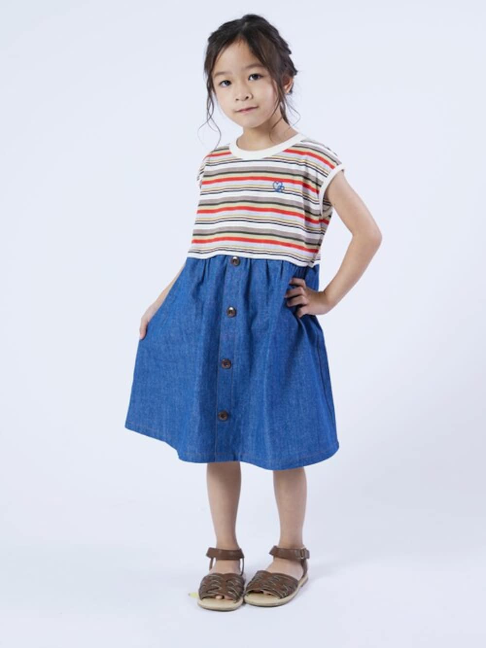 【ワンピース】 ボーダーにフロントボタンのスカートが軽快なワンピース コットン100%で肌当たり良くお子様にも安心素材◎ ワンピースなのでお着替えも楽々 デイリーに着て頂きやすいアイテムです