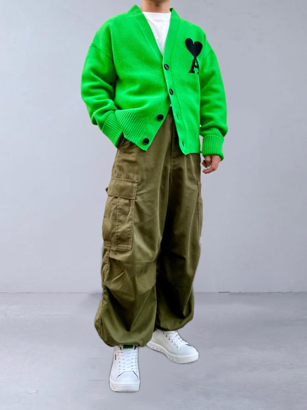 amiparisのニットカーディガンにスーパーワイドカーゴパンツを合わせて、足元はGORE-TEXのスニーカーを!