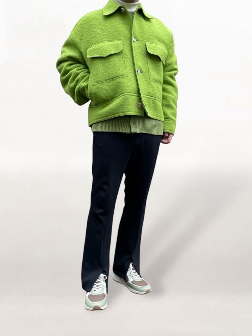 ワッフルソールとリサイクルメッシュの組み合わせにより、軽量で履き心地の良さが人気のモデルです。 スマートな木型のため、リラックスしたスタイルからキレイめなスタイリングにマッチします。 こちらのグリーンは、Desserto(サボテン由来の素材)& リサイクルメッシュを採用しています。 グリーンはカラーリングが綺麗なので、アウターも色鮮やかなグリーンのブルゾンで合わせました。