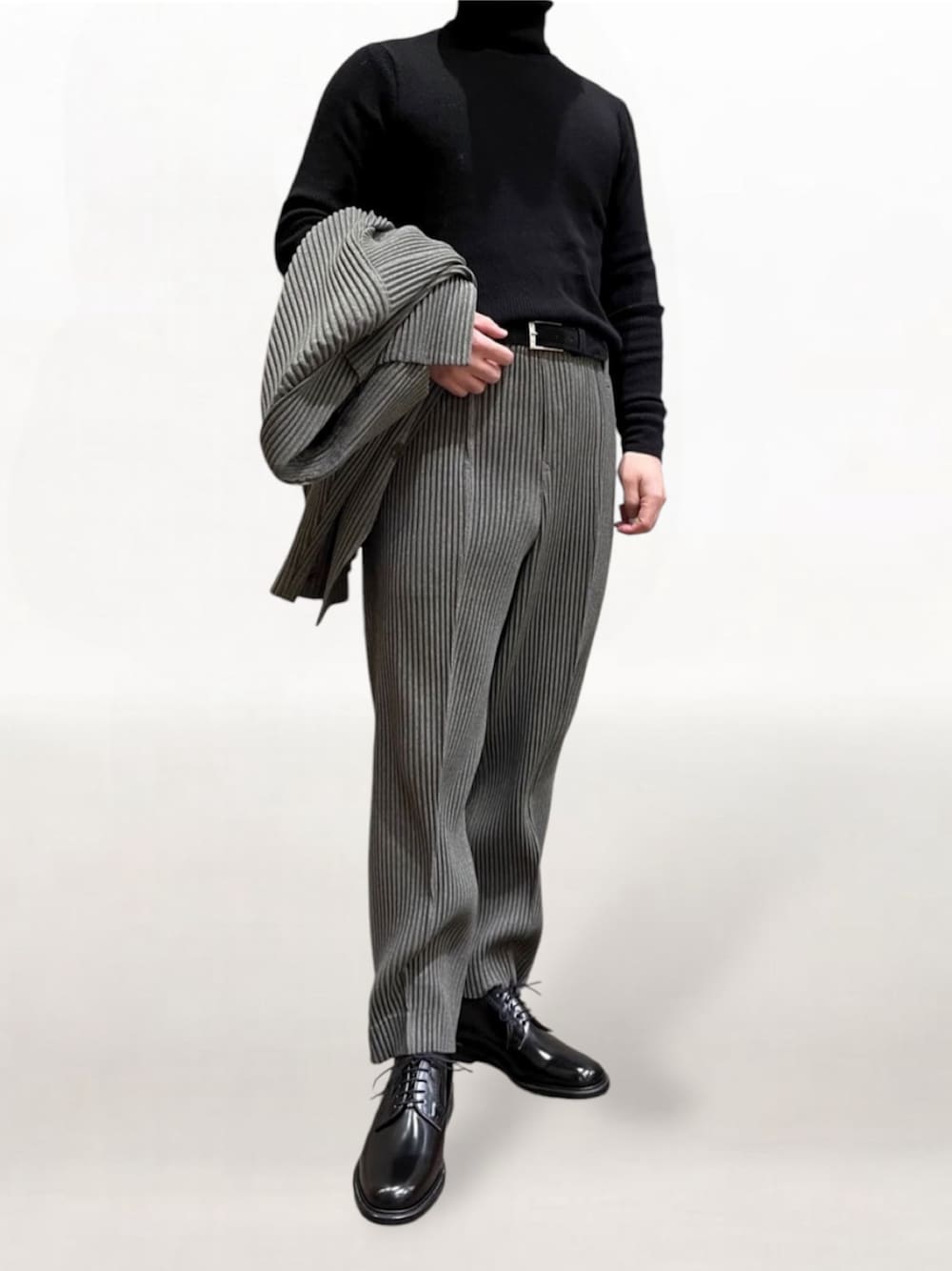 ウールライクのプリーツセットアップにブラックのタートルネックを合わせた、大人カジュアルにダービーシューズを👞 シンプルなプレーントゥ【2504】はオンオフで着用していただけるのはもちろんのこと、グッドイヤーウェルト式製法で、頑丈で足馴染みがいいのが特徴です。