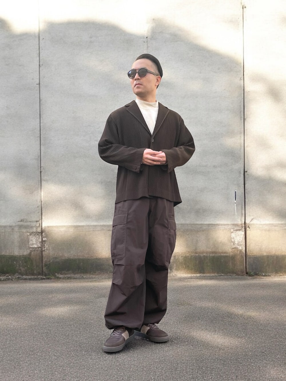 プリーツ素材のジャケットを主役に、全体をブラウン〜ダークトーンでまとめたミニマルスタイリング。 縦のプリーツが生む陰影が、シンプルながらも奥行きのある表情を演出してくれます。 インナーは白でクリーンさをプラスし、重たくなりがちな配色に抜け感を。 ボトムスにはワイドなカーゴパンツを合わせ、上品さの中に程よいラフさと現代的なボリューム感を加えています。 足元は落ち着いたカラーのスニーカーで、全体のトーンを崩さず自然に馴染ませました。 モード感と日常性を両立させた、大人のためのリラックススタイルです。