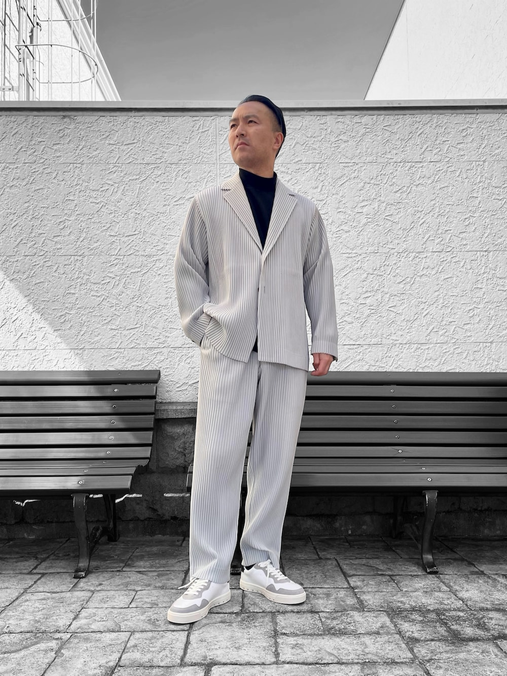 HOMME PLISSÉ ISSEY MIYAKEのプリーツセットアップは、縦のラインを強調しながらもリラックス感のあるシルエットが魅力。インナーにブラックのモックネックを合わせることで、全体を引き締め、都会的で洗練された印象にまとめました。 足元はREGALのスニーカーでクリーンに外し、上品さと軽快さを両立。モード感のあるセットアップを、デイリーにも取り入れやすいバランスに仕上げた大人のスタイリングです。