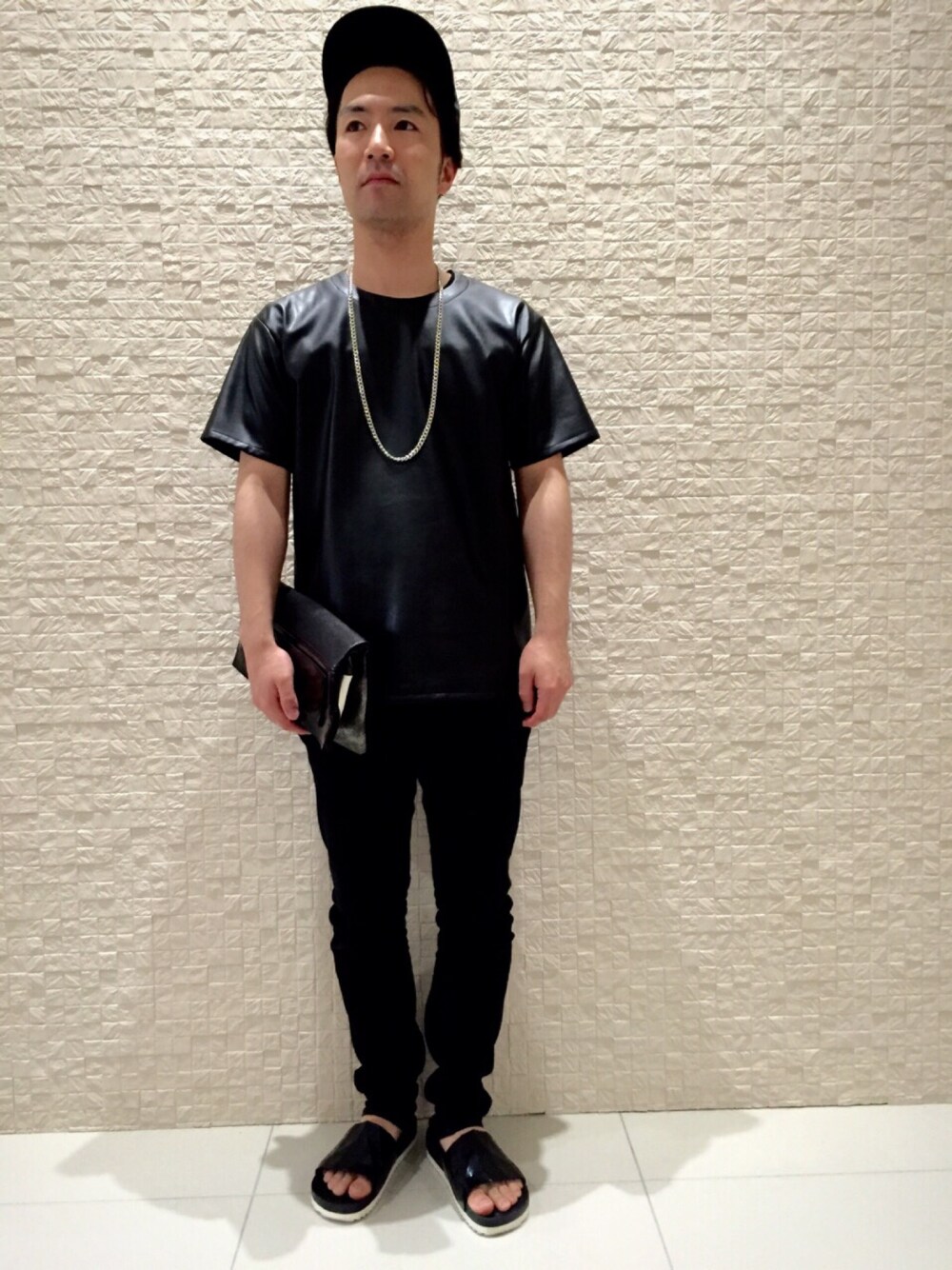 オールブラックコーデです。 WEGOで買ったカットソーでレイヤード😎 サンダルはいつものです😁