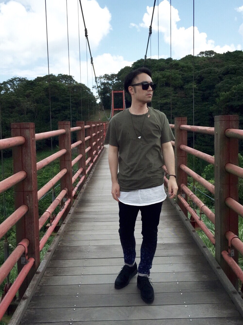 大自然の中で、パシャリ😁 吊り橋の上は風があって気持ちいい〜😄 シンプルにカットソーのレイヤードで😎