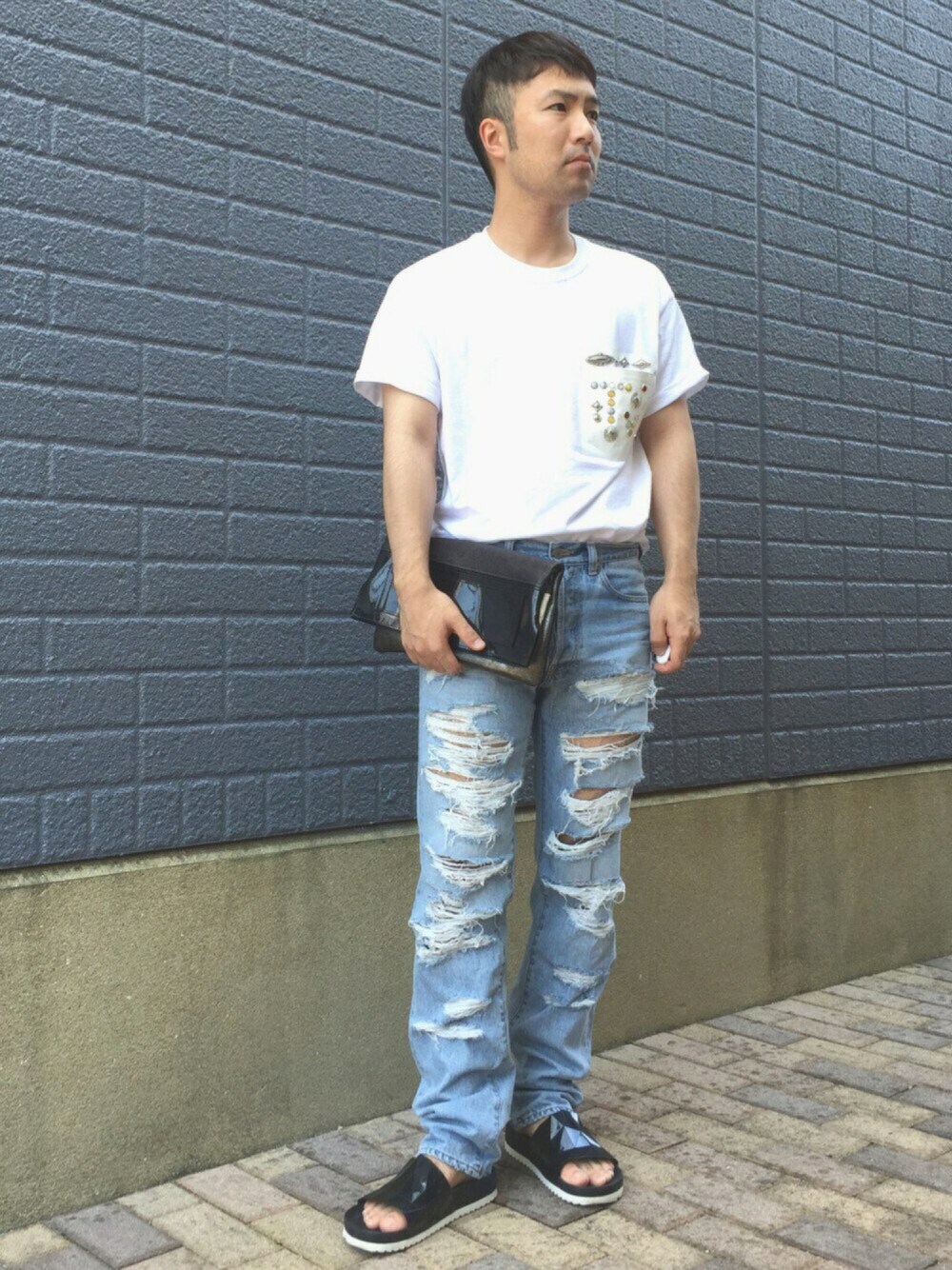 真夏のど定番スタイル😎 ホワイトTシャツにデニム、足元はサンダルで😄 シンプルなコーデですが、エッジの効いたアイテムで固めました😎