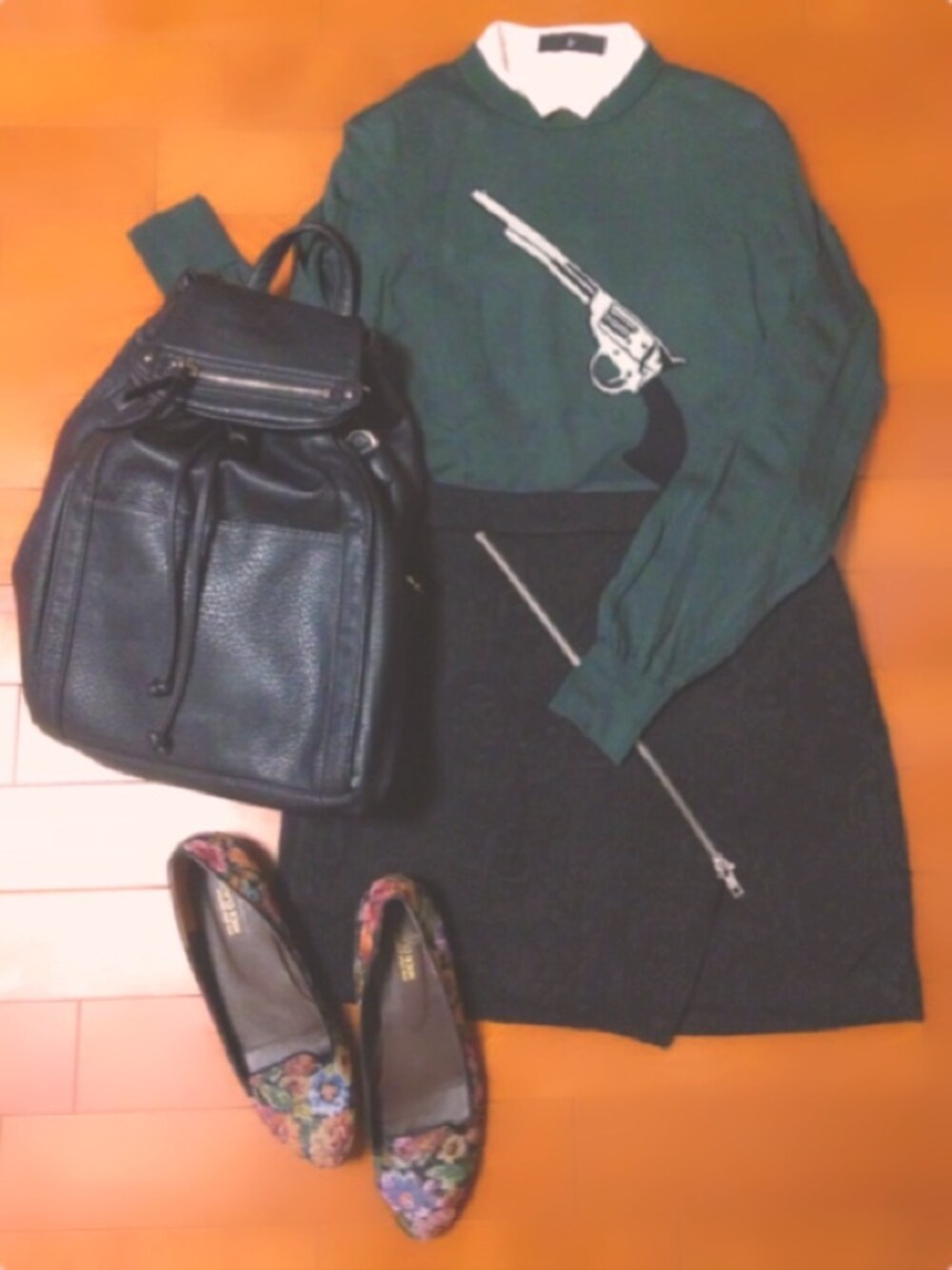 アウターとタイツ入れ忘れた チビ襟シャツにピストル柄ニット!